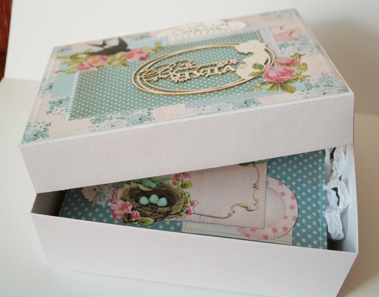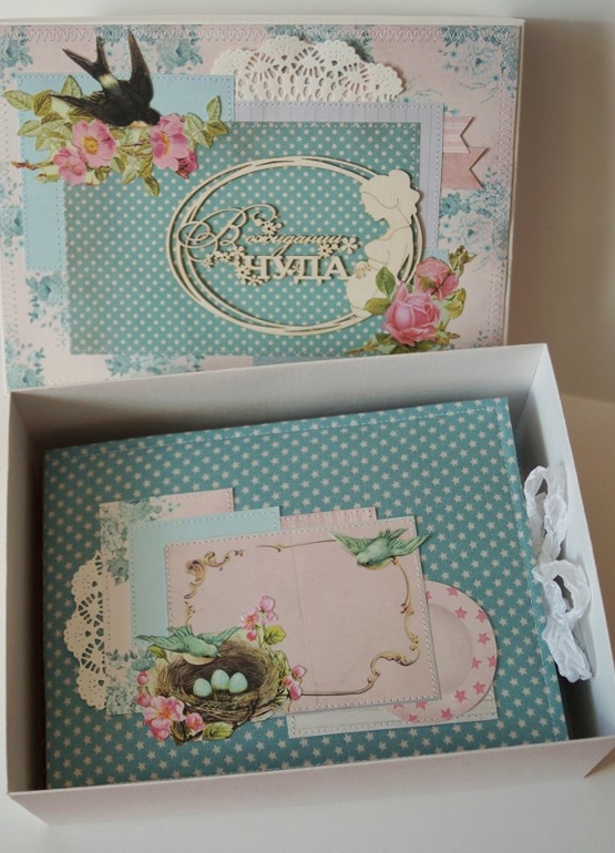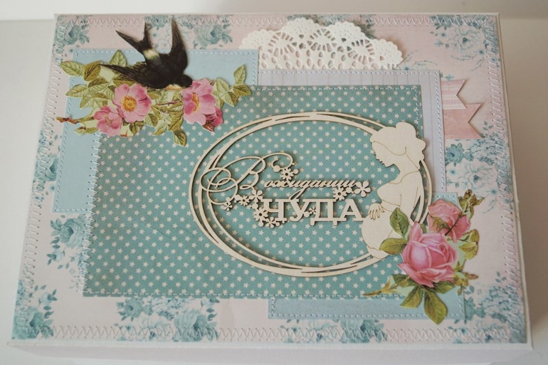 Понимала что это должна быть нежная работа, но знала и о Нелюбви моей заказчицы к объемным розочкам-цветочкам, да к тому же пол малышей не известен. В процессе работы мне кажется я всю душу вложила в бумагу - до того прониклась)))))))