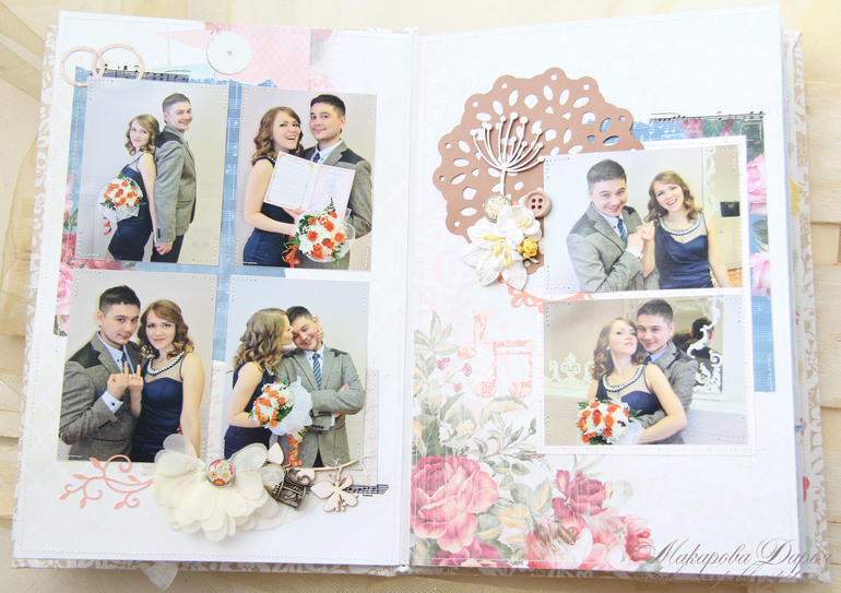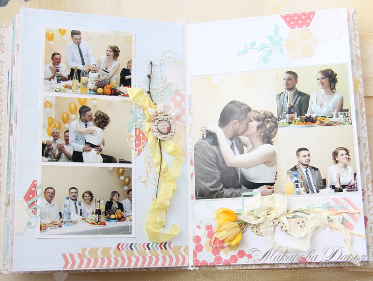 Настя (невеста) просила сделать некоторые странички нежными, а некоторые яркими и добавить музыкальных элементов, т.к. они с женихом оба музыканты. Мне кажется, я справилась с поставленной задачей)![]()