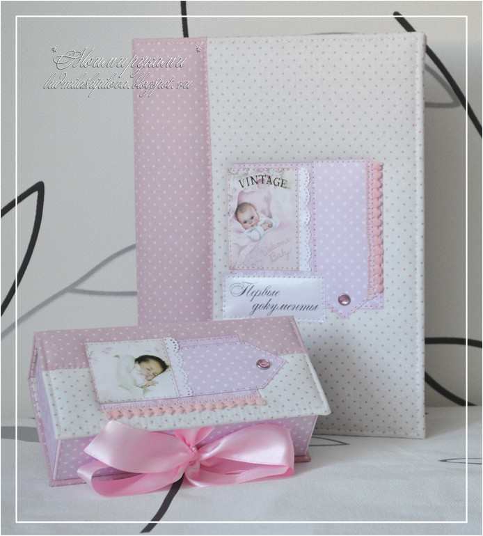 Обложки на паспорт и свидетельстваДД! Сегодня покажу нежнейший и очаровательный набор для малышки Анечки, который состоит из папочки для документов и коробочки для хранения первых и важных вещей )))