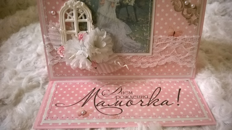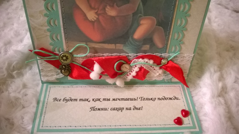 Оформление мне еле далось и я не довольна. Сюда хотелось просто завязать детский бантик. Но заказчица сказала, что прямо в точку. Чему я, безусловно, рада. Однако открытки - все же не мое занятие!
