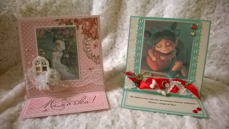4) Открытки. Вот здесь меня клинило не по-детски. Ну никак не шла работа. Заказчица выбрала картинки плохого качества, выбирала другие, причем одна из них - это чья-то открытка из инета, только обрезанная со всех сторон. Объясняю, что не получится эту открытку примостить на мою открытку. Долго выбирали.