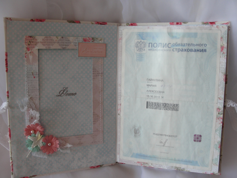 папка обтянута хлопком, завязывается на хлопковое кружево. Два разворота с местом для фото, медицинского полиса, СНИЛСа и свидетельства о рождении,