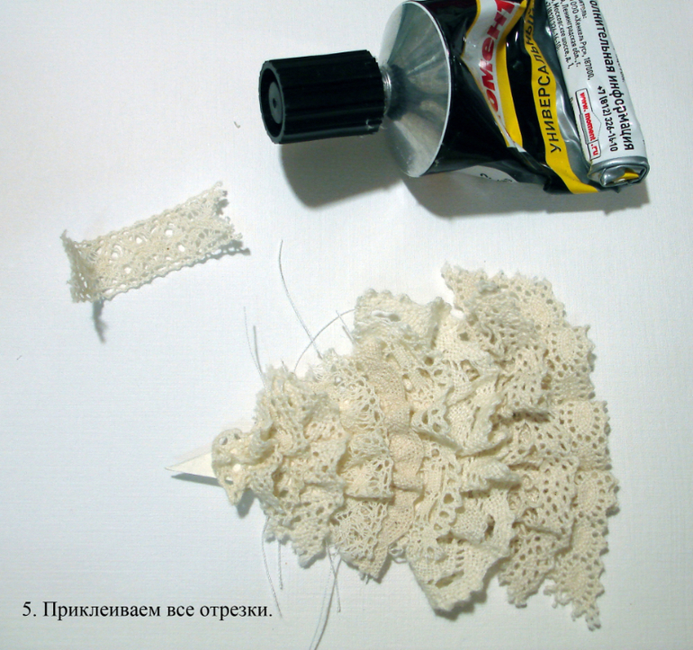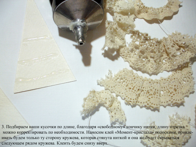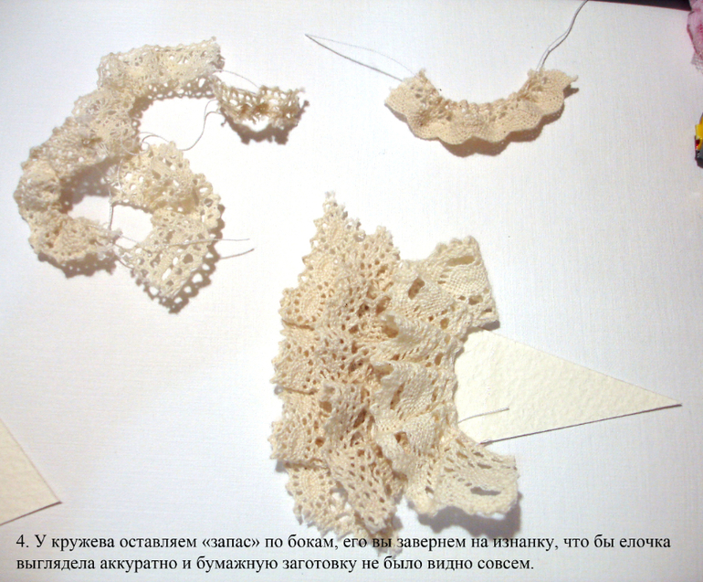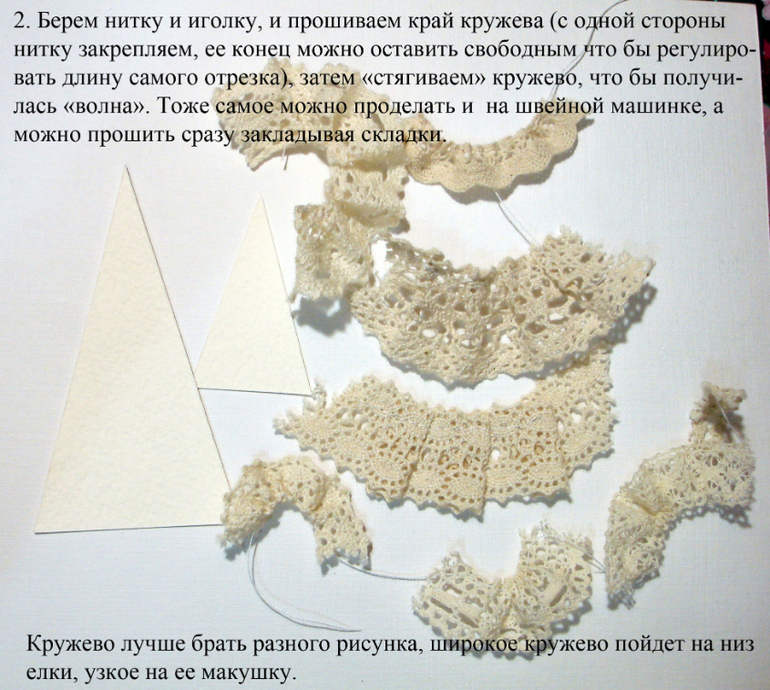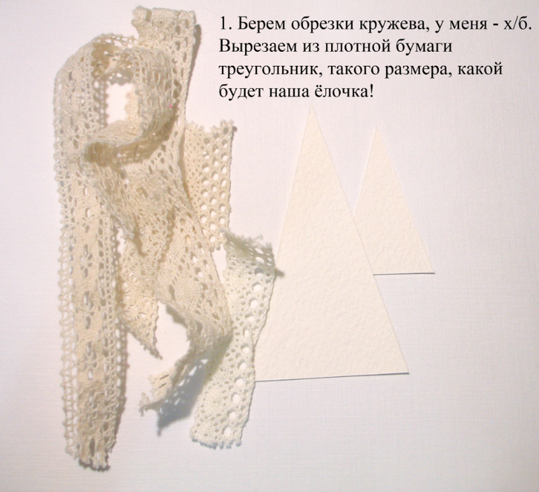 СОВМЕСТНЫЕ ПРОЕКТЫВидимо я так и не соберусь провести "нормальный" СП к новому году, нет сил и времени, но все же хочу показать то, что я успела отснять. Может быть кому-то пригодится мой небольшой МК. Итак, для меня новый год - это елка, однозначно! Вот поэтому я решила сделать елочки разные, в разных техниках и разного размера, по возможности буду отснимать процесс и выкладывать здесь. Начала я с шоколадниц для воспитателей сыну в садик, а украсить их решила елками. Когда то давно я видела в интернете елочки из кружева, нарезала куски разного кружева и приклеила их на треугольник, результат мне не понравился, получилась не елочка, а кружевной треугольник! (где-то эта елка у меня до сих пор валяется) На этот раз я решила сменить технику, хорошо что обрезков кружева у меня достаточно, особенно кремового цвета, вот его то я и взяла.