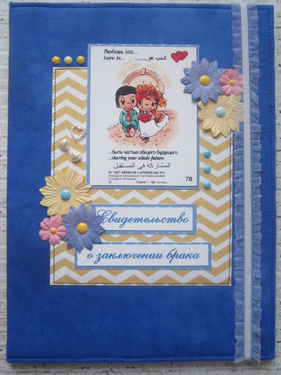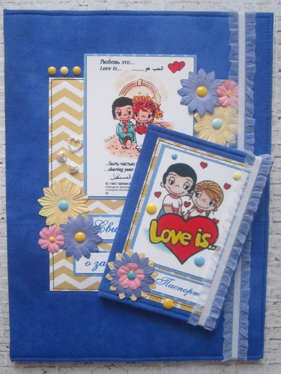 Конкретно для следующей папочки у меня есть небольшая предыстория. Летом одна девочка попросила сделать на свадьбу друзей сберегательную книжку из "жвачковой" серии Love is... Спустя какое-то время, сама невеста позвонила и попросила сделать папку для свид-ва о браке и обложку для паспорта по мотиву сберкнижки. Получилось вот что.