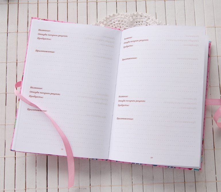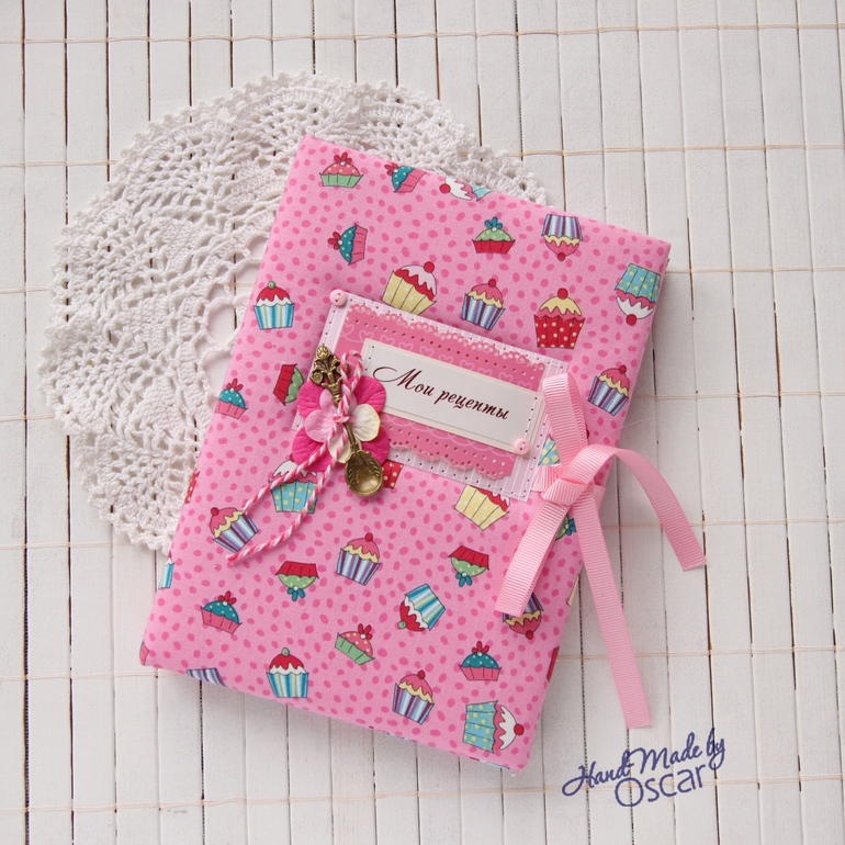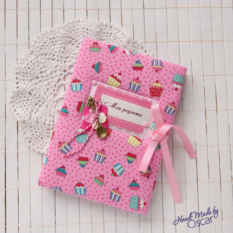 Формат А5, обложка из хлопка, завязывается на ленту, внутри готовый кулинарный блокнот хорошего качества