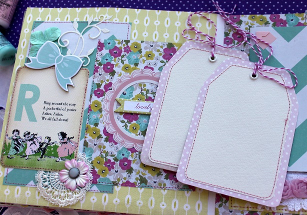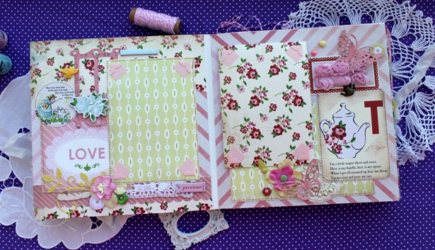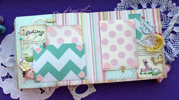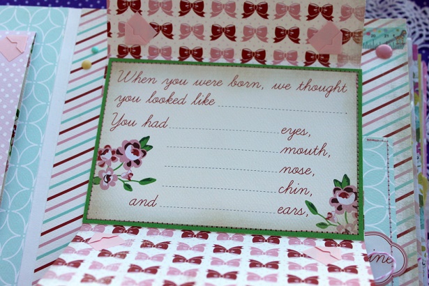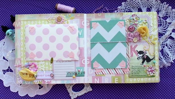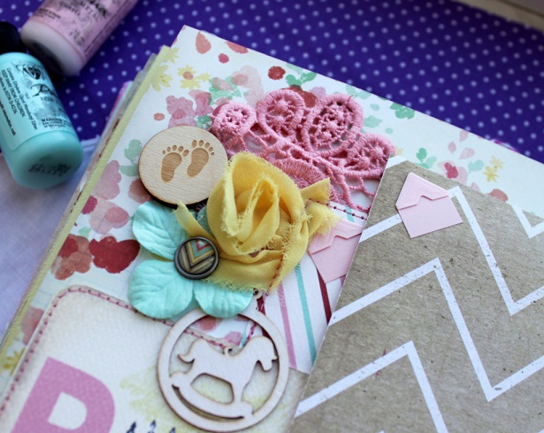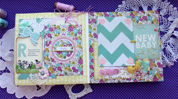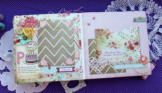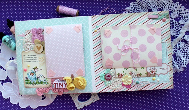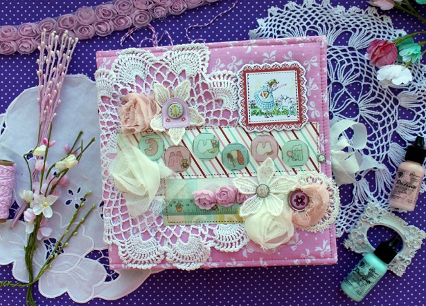 Сегодня я с альбомом для малютки с прекрасным именем Эмилия. Альбом делался в подарок к первому Дню рождения малышки и вмещает около 30 фото, места для записей, конверт для диска, тэги для отпечатков ножки и ручки.