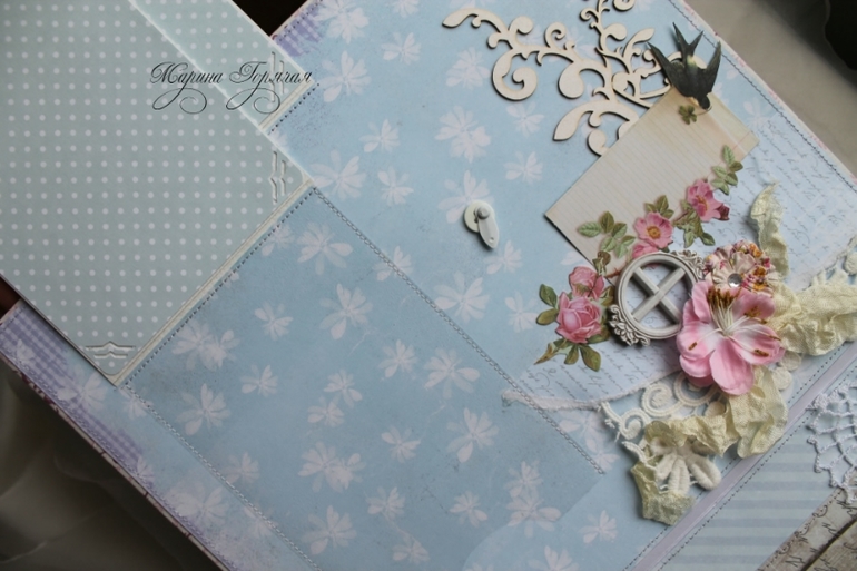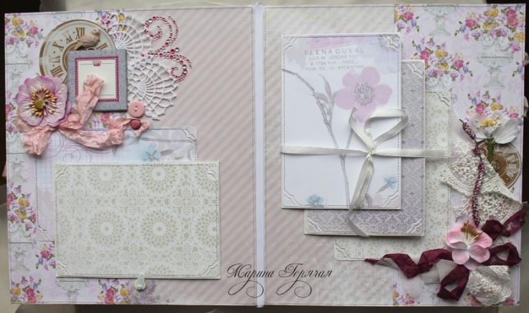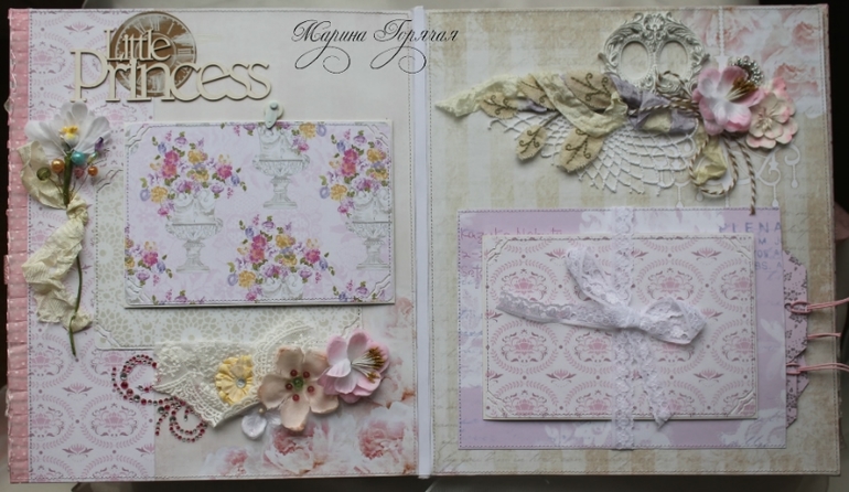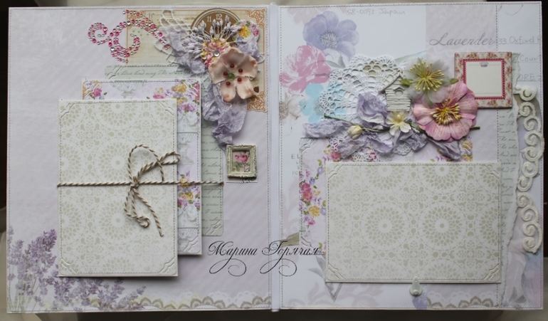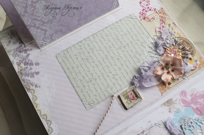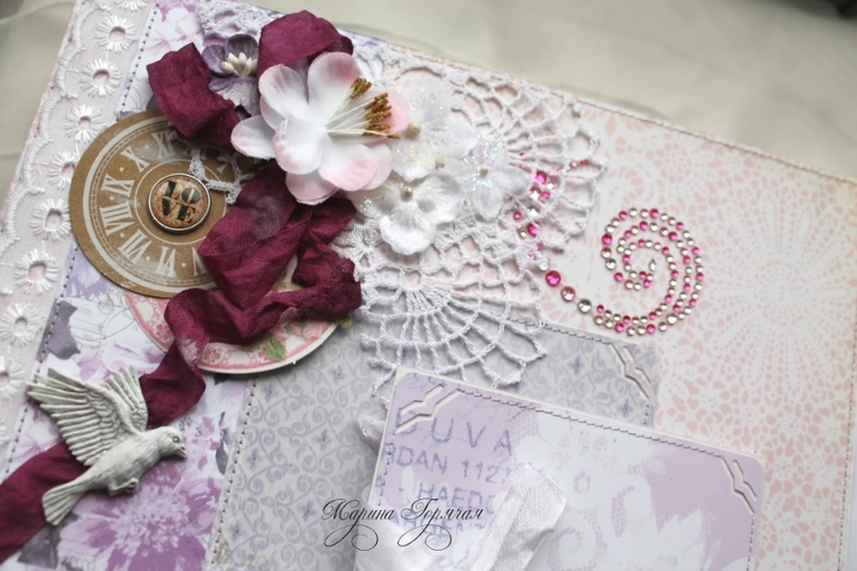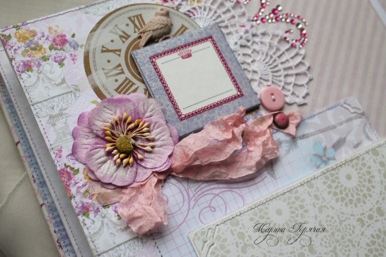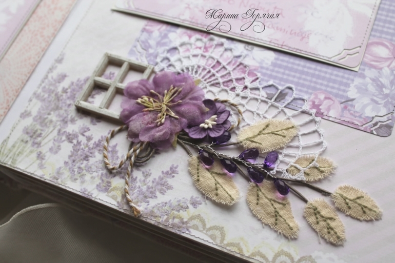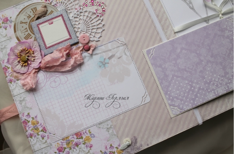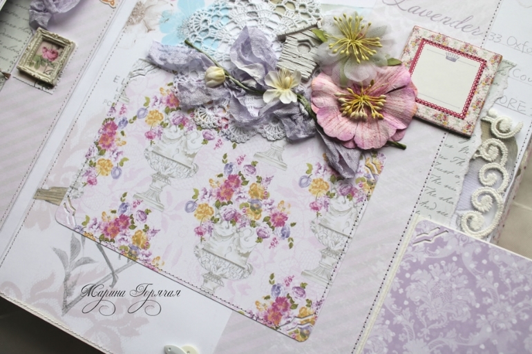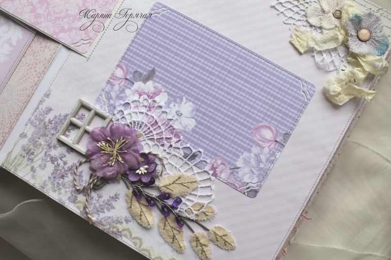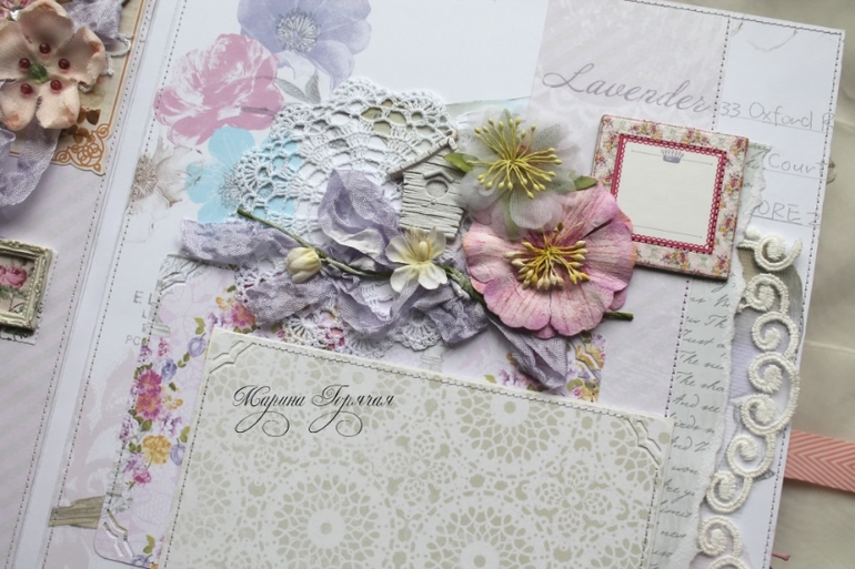 Формат альбома 24 на 28 см, рассчитан примерно на 50 фото стандартного формата."Звездой" этого альбома стала великолепнейшая коллекция Prima Meadow Lark, которую я скупила полностью - от бумаги до кристаллов и керамических плиточек! К ней я добавила нежнейшую Fleur Design (Шебби-шик прованс и Базовая), немного Tilda Autumn Lilac и дорогущую Maya Design!))) И, конечно же, кружева-кружева!