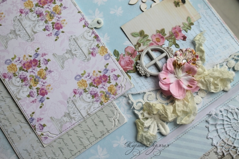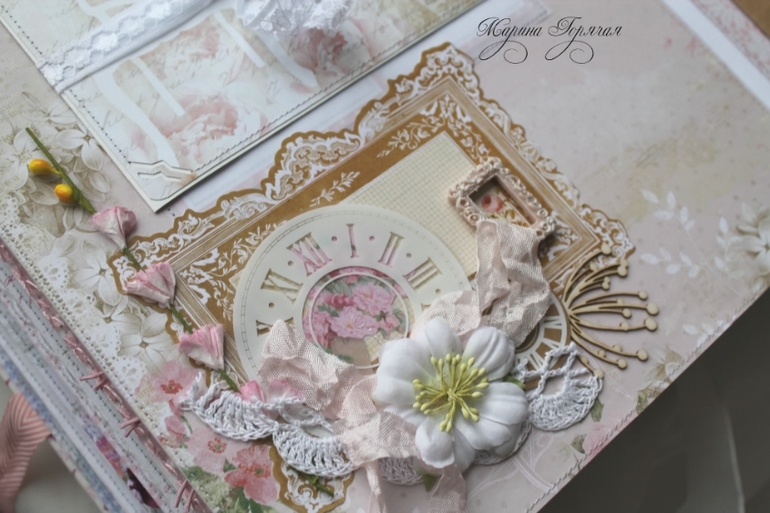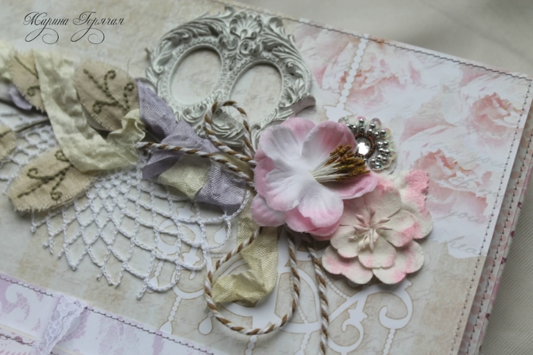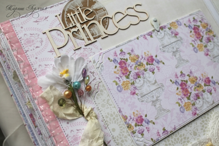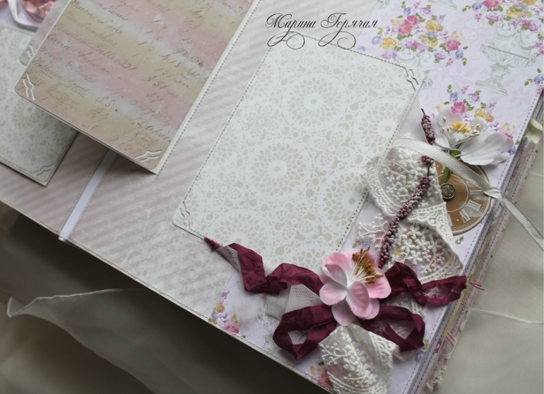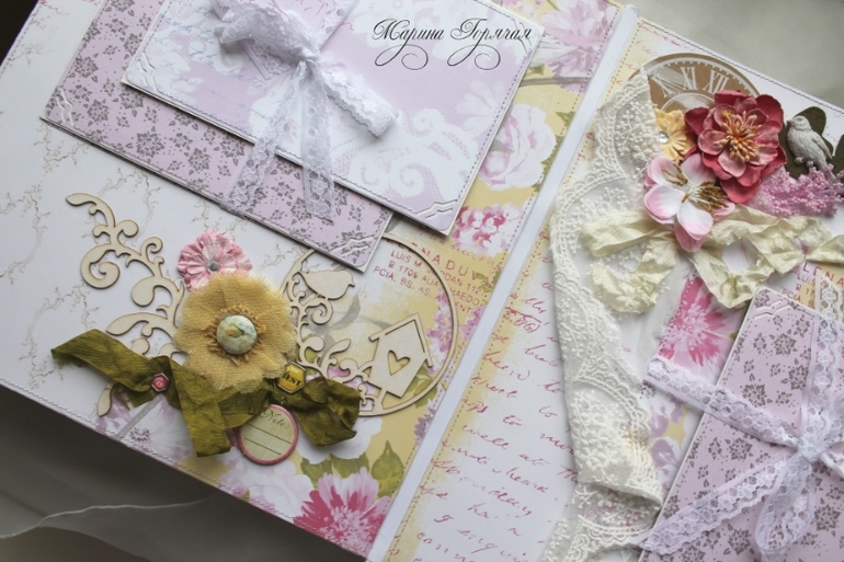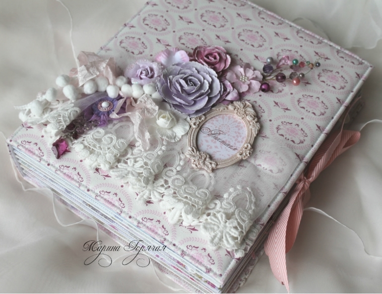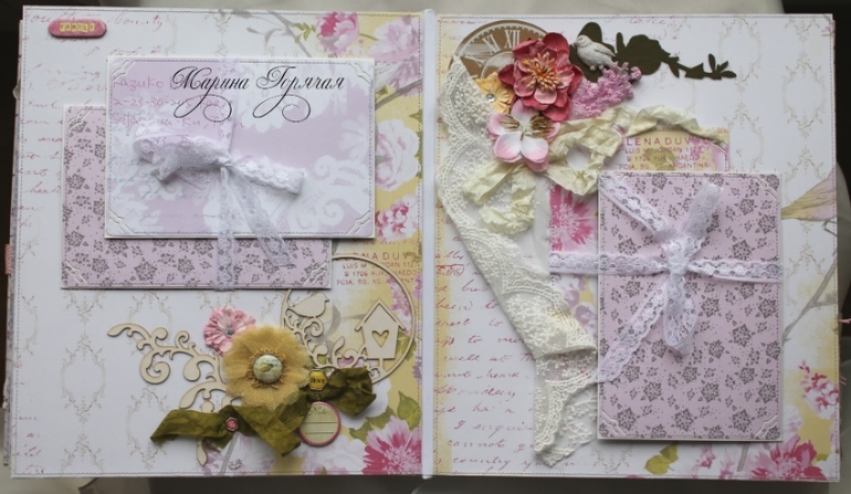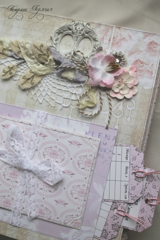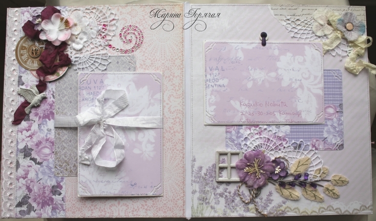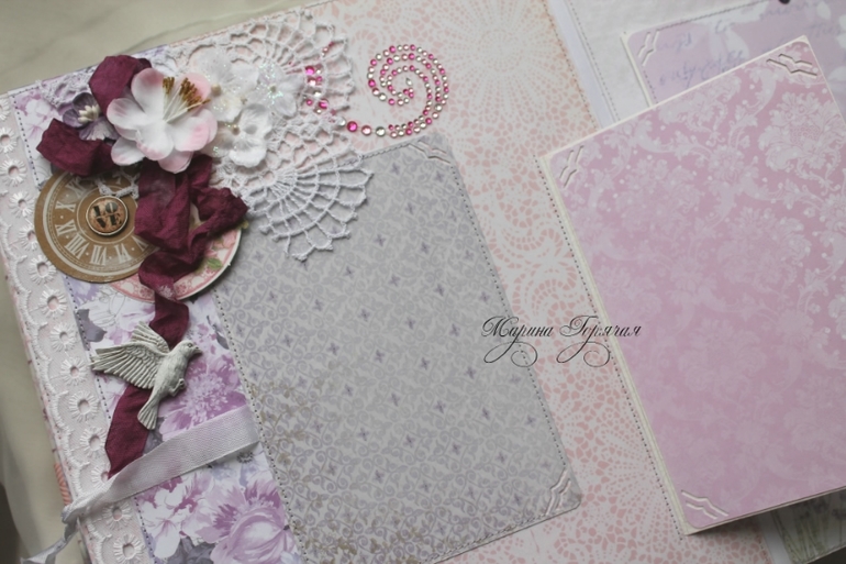 Формат альбома 24 на 28 см, рассчитан примерно на 50 фото стандартного формата."Звездой" этого альбома стала великолепнейшая коллекция Prima Meadow Lark, которую я скупила полностью - от бумаги до кристаллов и керамических плиточек! К ней я добавила нежнейшую Fleur Design (Шебби-шик прованс и Базовая), немного Tilda Autumn Lilac и дорогущую Maya Design!))) И, конечно же, кружева-кружева!