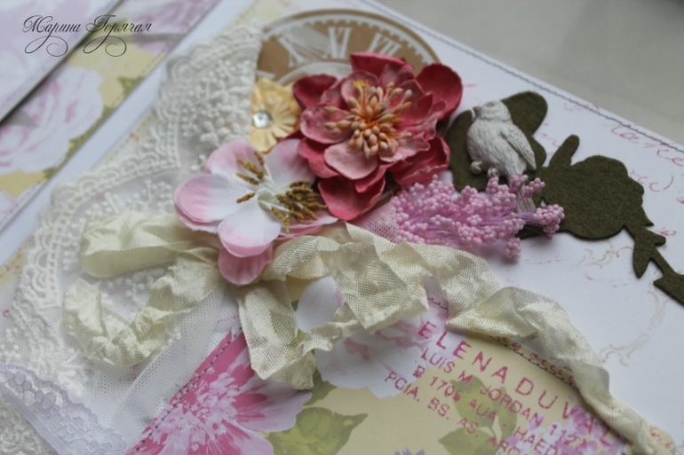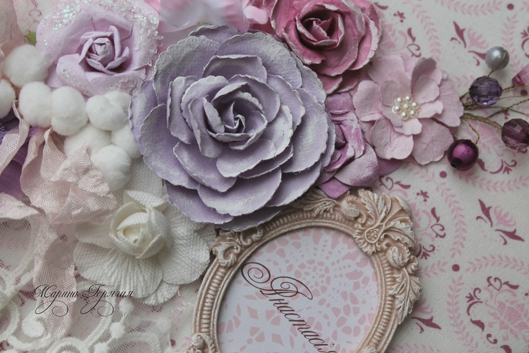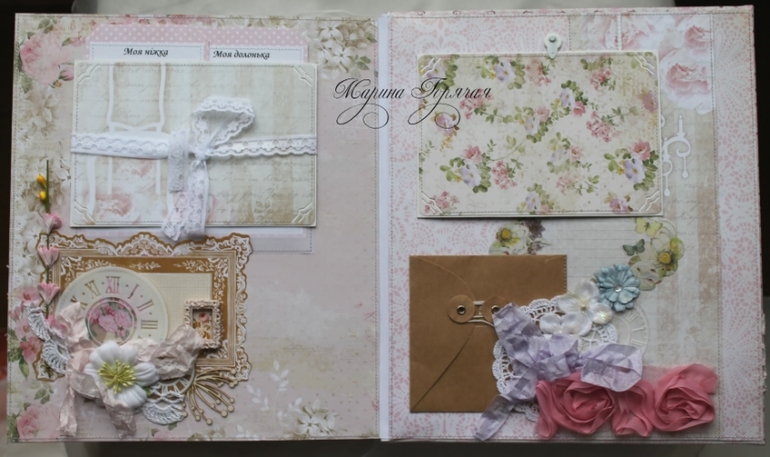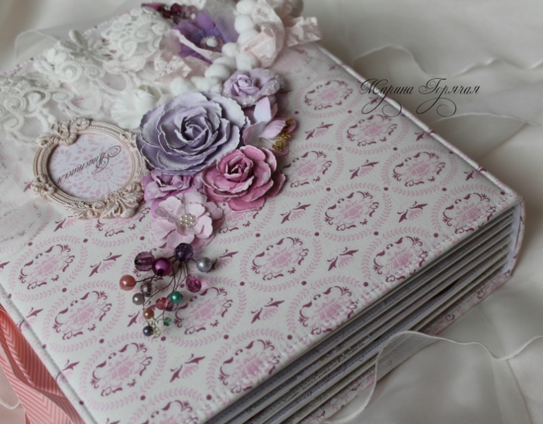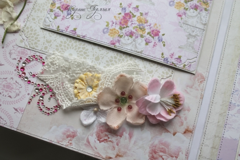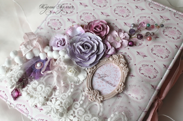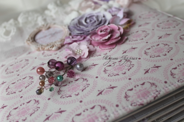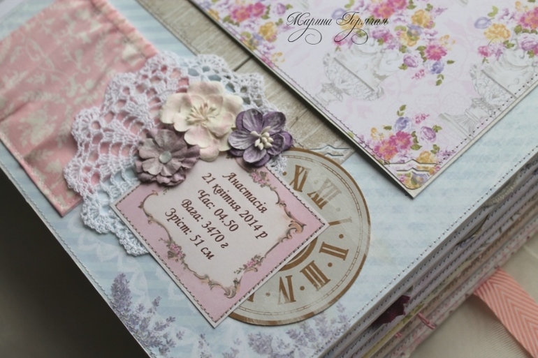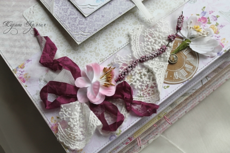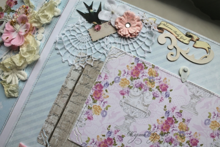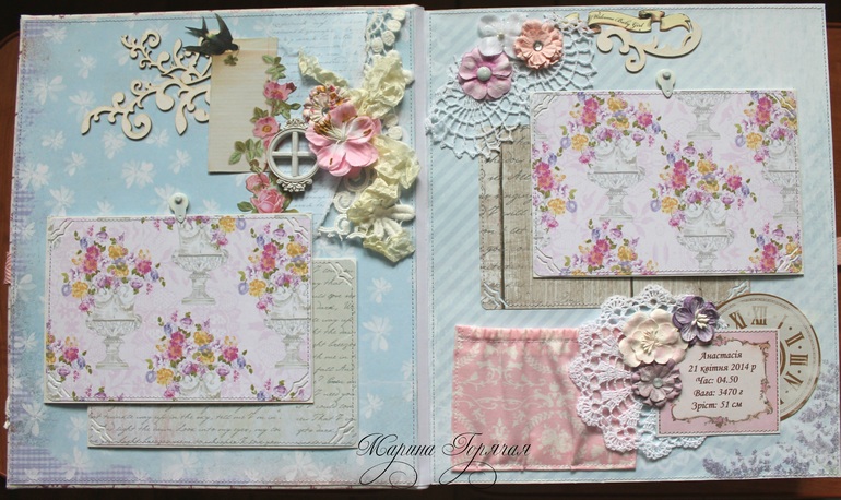 Формат альбома 24 на 28 см, рассчитан примерно на 50 фото стандартного формата."Звездой" этого альбома стала великолепнейшая коллекция Prima Meadow Lark, которую я скупила полностью - от бумаги до кристаллов и керамических плиточек! К ней я добавила нежнейшую Fleur Design (Шебби-шик прованс и Базовая), немного Tilda Autumn Lilac и дорогущую Maya Design!))) И, конечно же, кружева-кружева!
