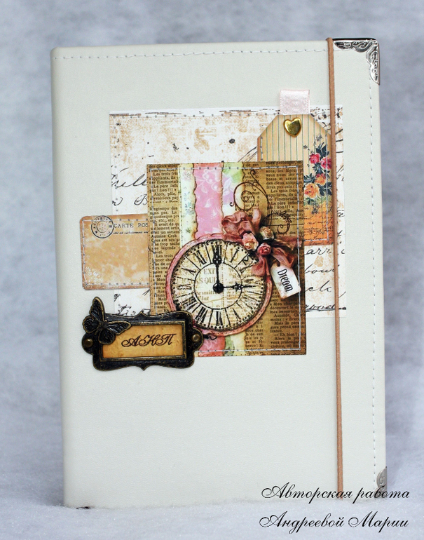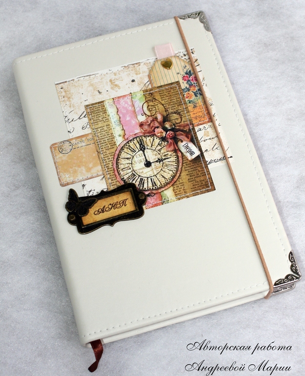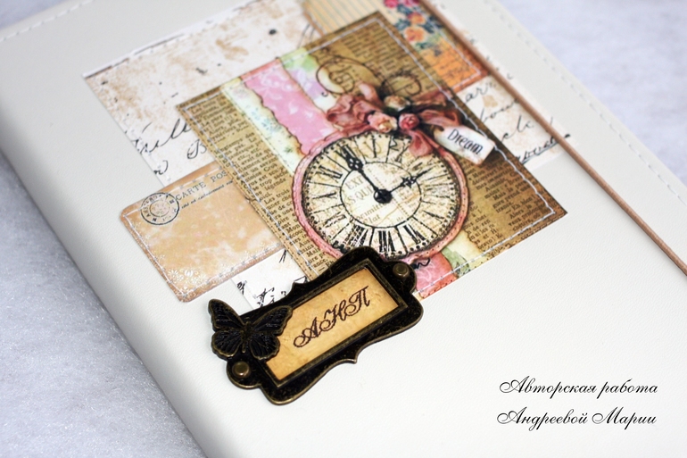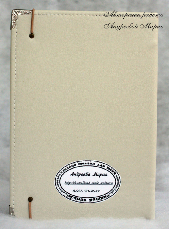 БлокнотыМуж решил что-то подарить на НГ своей маме и мне пришлось оформить лежавший у нас готовый блокнот. Формат А5. Обложка - молочный кожзам.