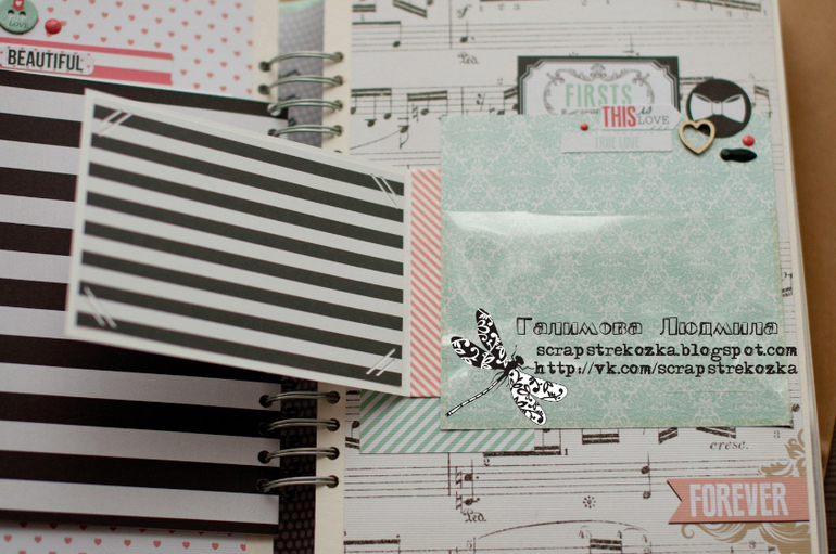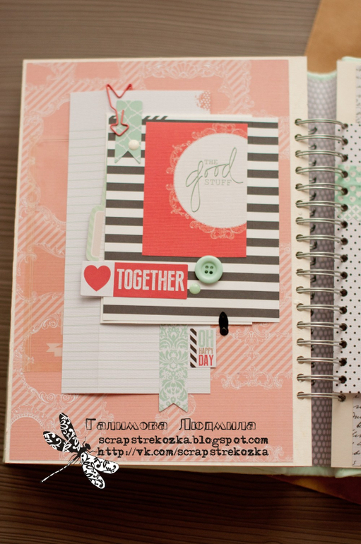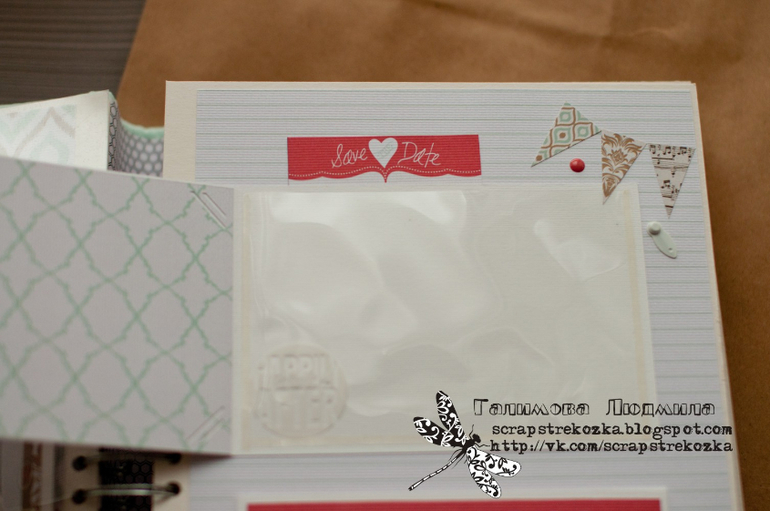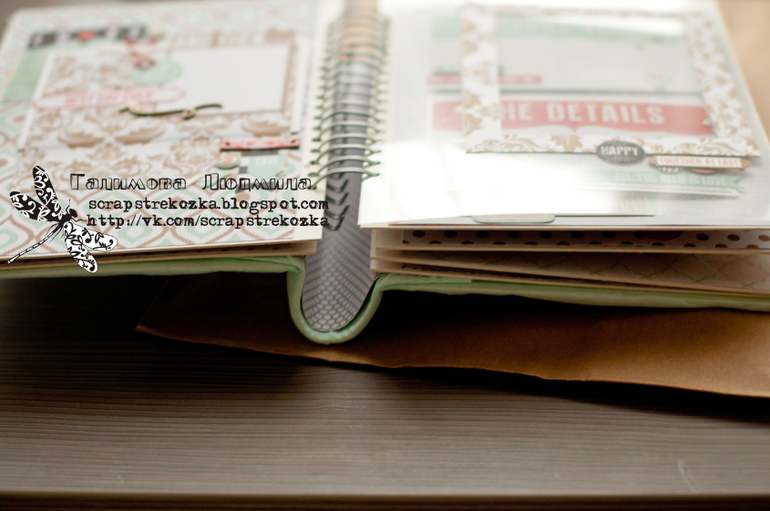 Альбом формата 20х30 см (что-то мне этот формат все больше нравится!), переплет такой делала в первый раз, тоже немного неудачно, но в целом получился очень даже, только корешок слегка великоват, перестраховалась и оставила лишний сантиметр, а зря: в открытом виде корешок немного мешает. Всего 5 разворотов, количество фотографий не считала, но в целом не малое. Плюс листы из прозрачной пленки и вкладыши-папочки для фото, есть и конверт для диска или дополнительных фото. Альбом укомплектован конвертом для денег и подарочным пакетом.