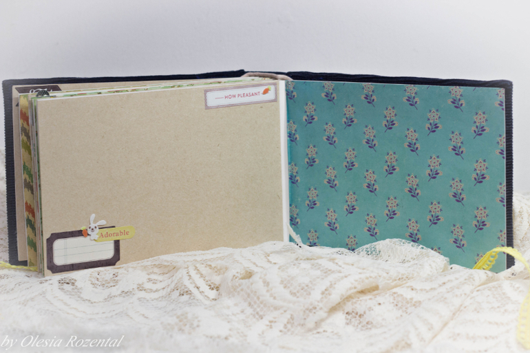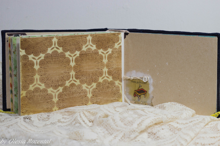 В общем альбомчик на 9 разворотов,18 страничек,немножко декора,есть места для записей всякой всячины. Обложка мягенькая,обтянута микро-вельветом,закрывается альбом на ленточку. Цена 40$+ 5$ доставка.Можно сделать такую кроху на девчачий лад =)
