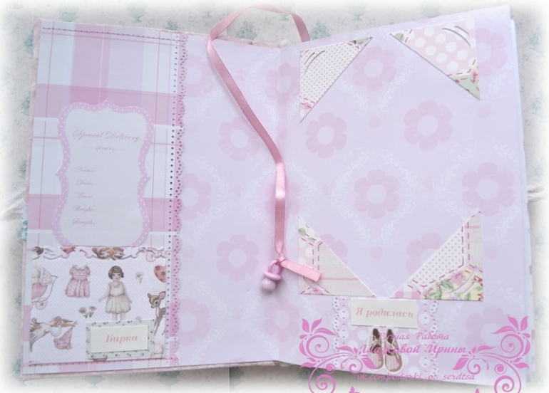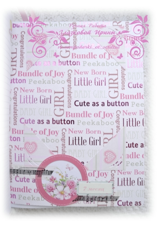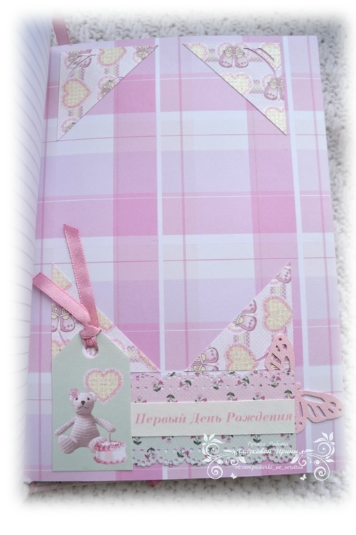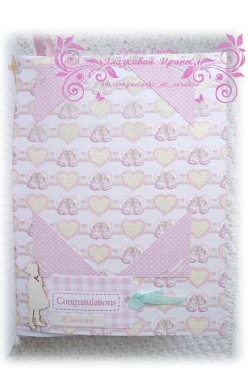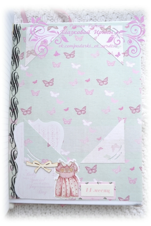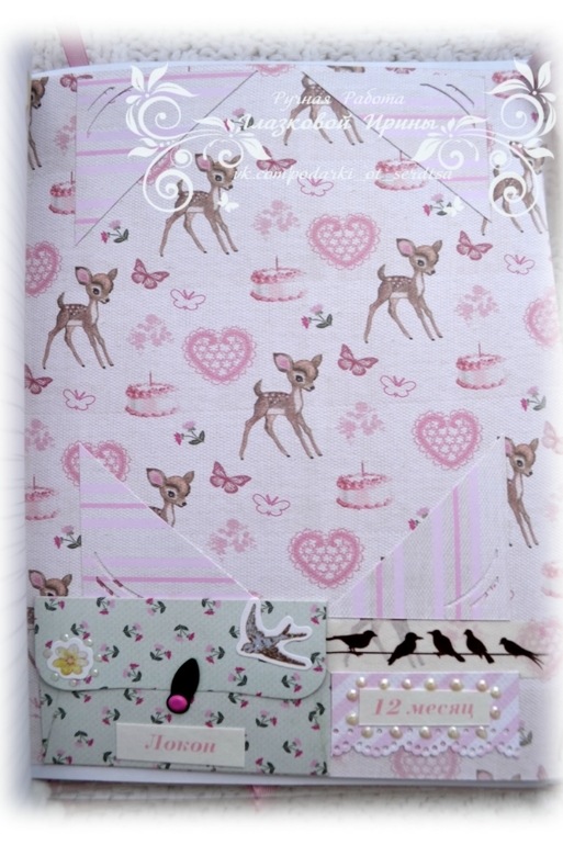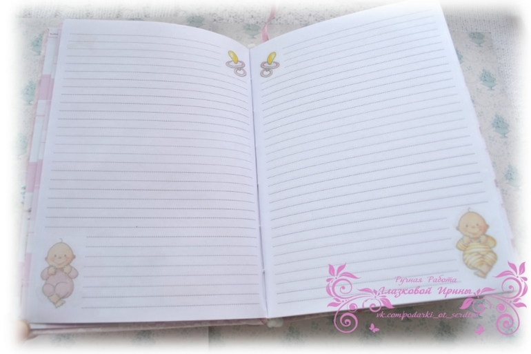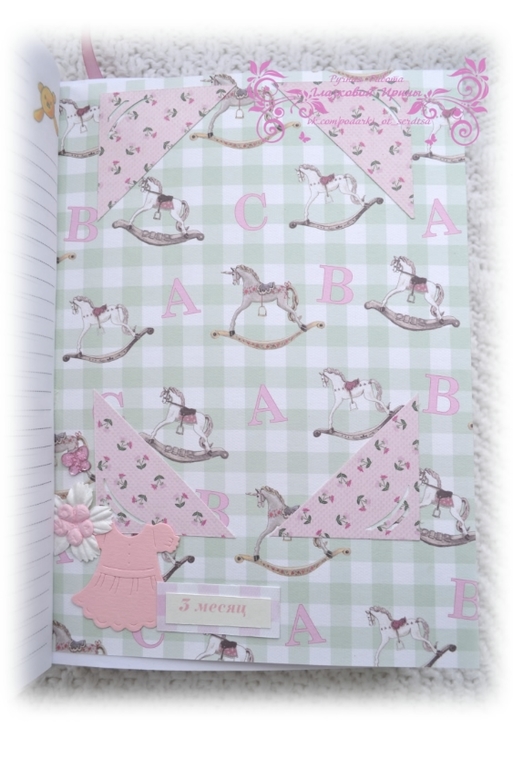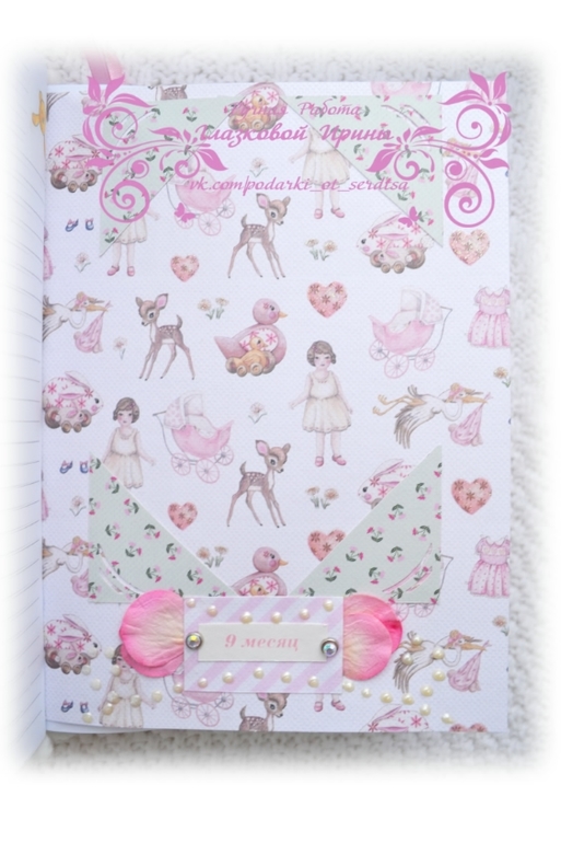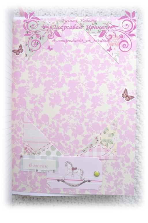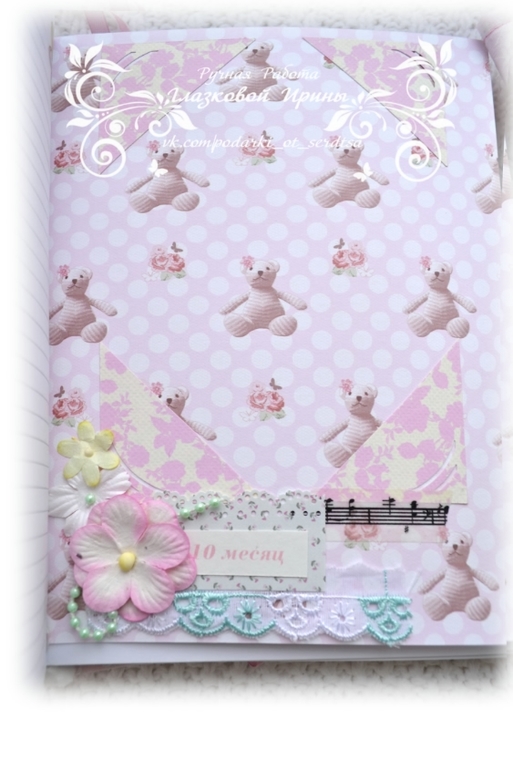 Блокнотик формата А5, 120 страничек, 12 разделителей по одному на каждый месяц жизни новорожденной крошки. Вмещает 14 фотографий - такой получился полноценный "альбомчик".