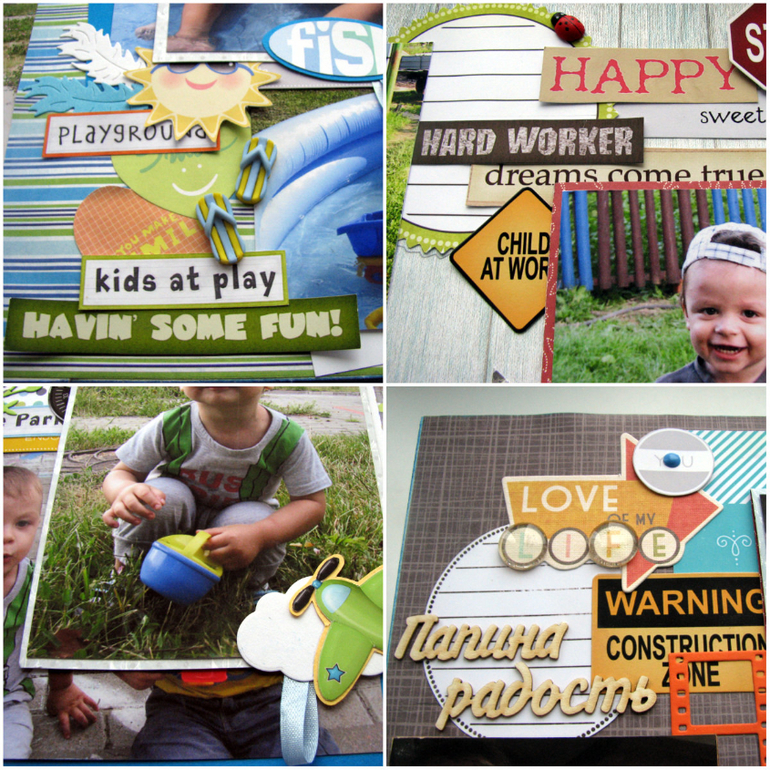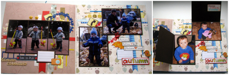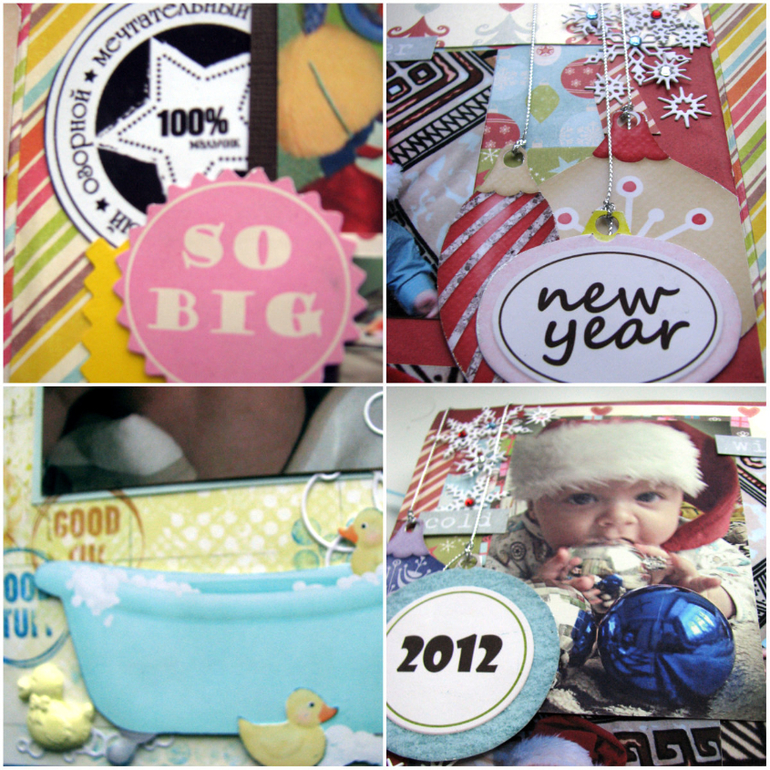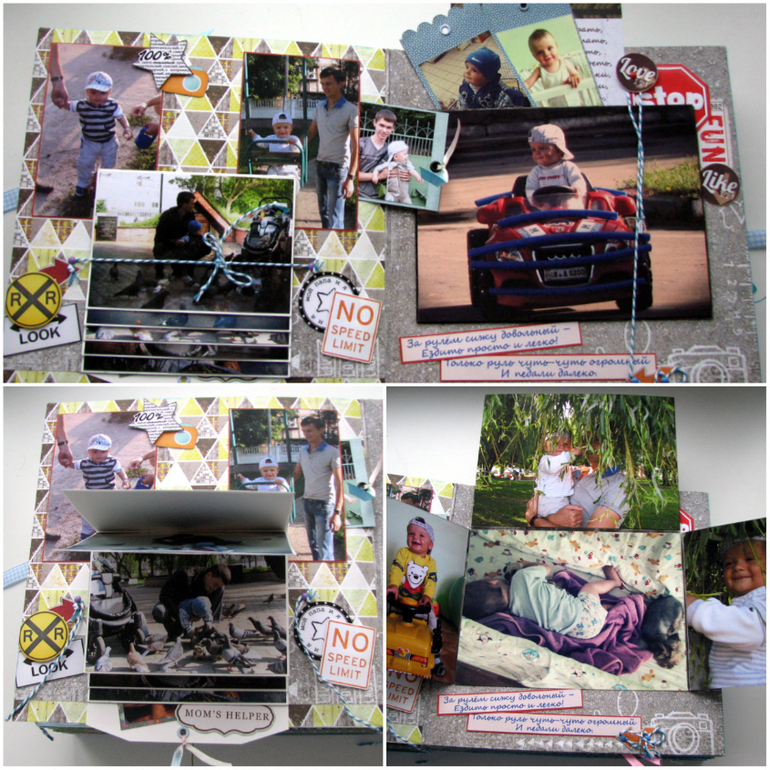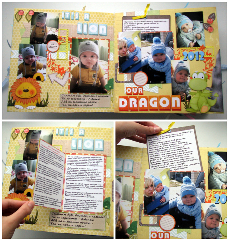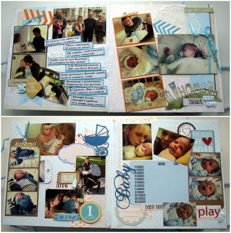 Изначально мной планировался альбом до 1 годика...но время пролетело быстро и только к 2-х летию сына я решилась таки попробовать. А так как только первый год делать было уже как-то не уместно, пришлось сразу делать и второй годик))) Так и получилось что мой альбом вместил в себя ( не помню точно) вроде 19 разворотов) и толщиной вышел( о ужас!!!) почти 9см. Своего рода такой альманах)))