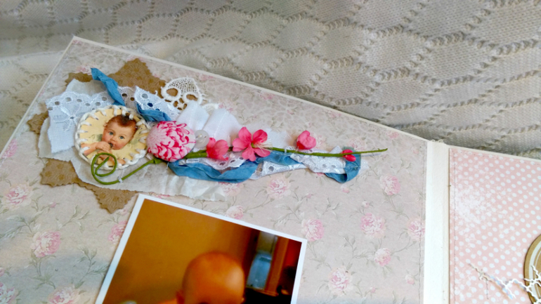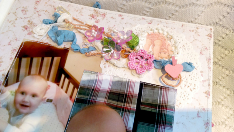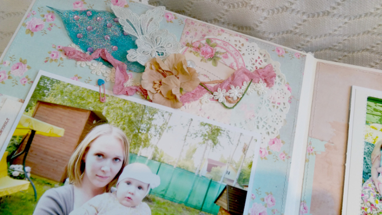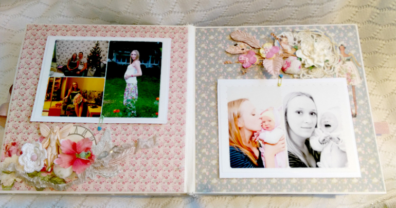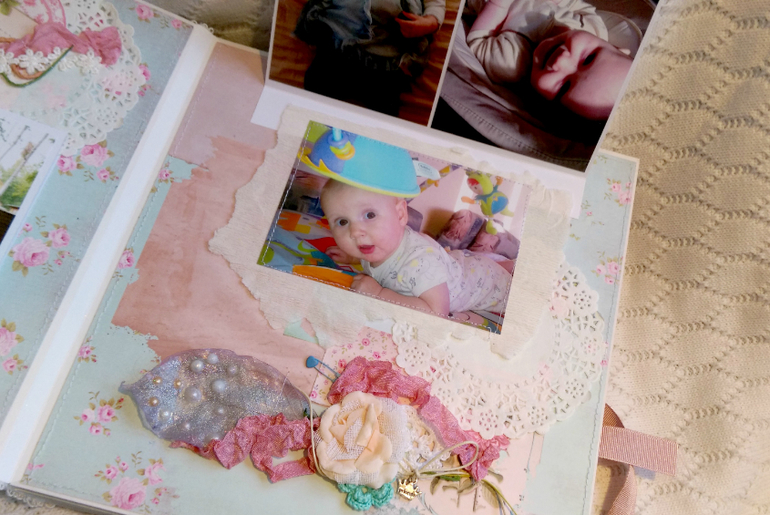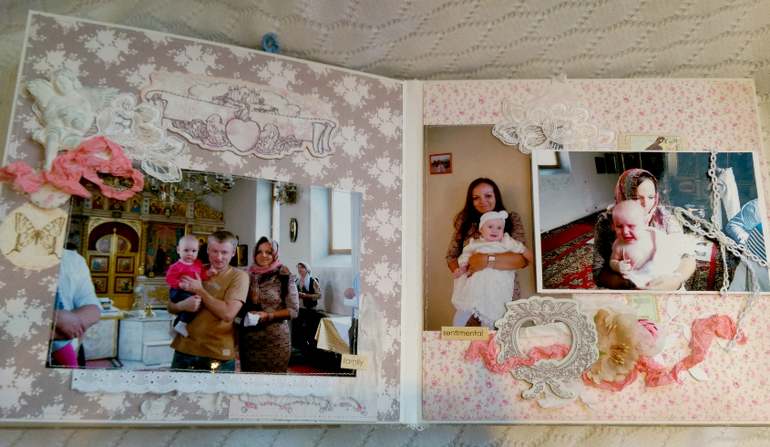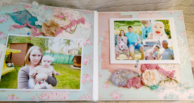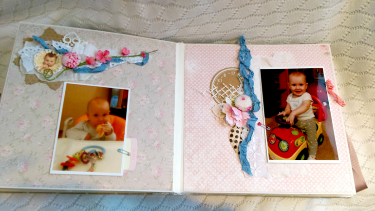Альбом для мааленькой девочки Анечки, про ее первый годик жизни. 25на25 на 16 стр около 70 фото.Обложка мягкая,обтянута тканью Tilda,этой же фирмы бумага в альбоме. В этом альбоме есть украшения ручной работы, развиваюсь,очень понравилось их делать.