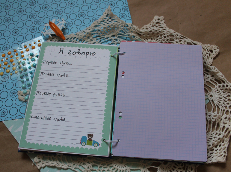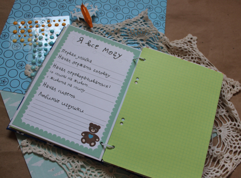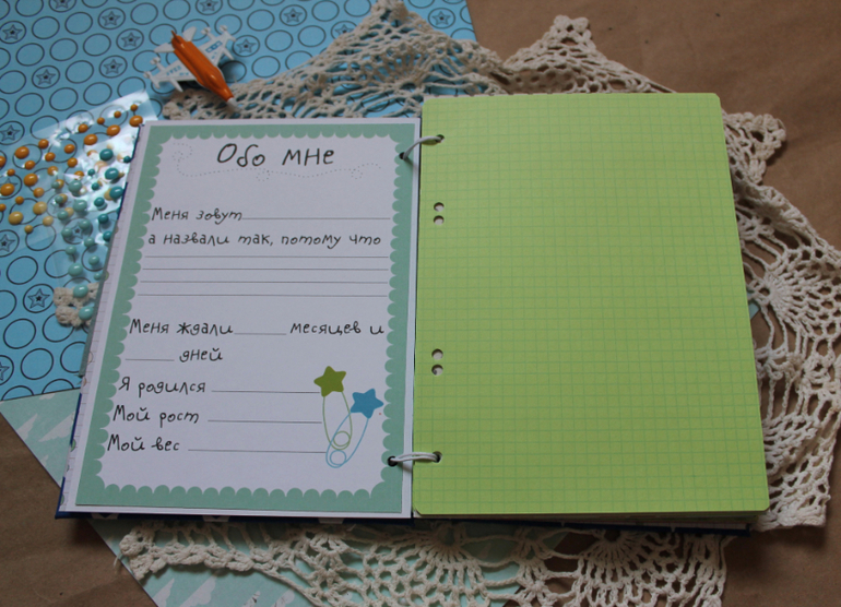 Покажу сегодня очередной детский заказ -для малыша Матвея. Звездный блокното -альбом,пухленький и тяжеленький.:) Включает в себя разделители с местом для 21 фото фото малыша , 8 карточек для записи важной информации/достижений,конверт для хранения важных заметок или вещей ,например бирочки с роддома .На форзаце мамочка попросила поместить красивое стихотворение про сыночка.