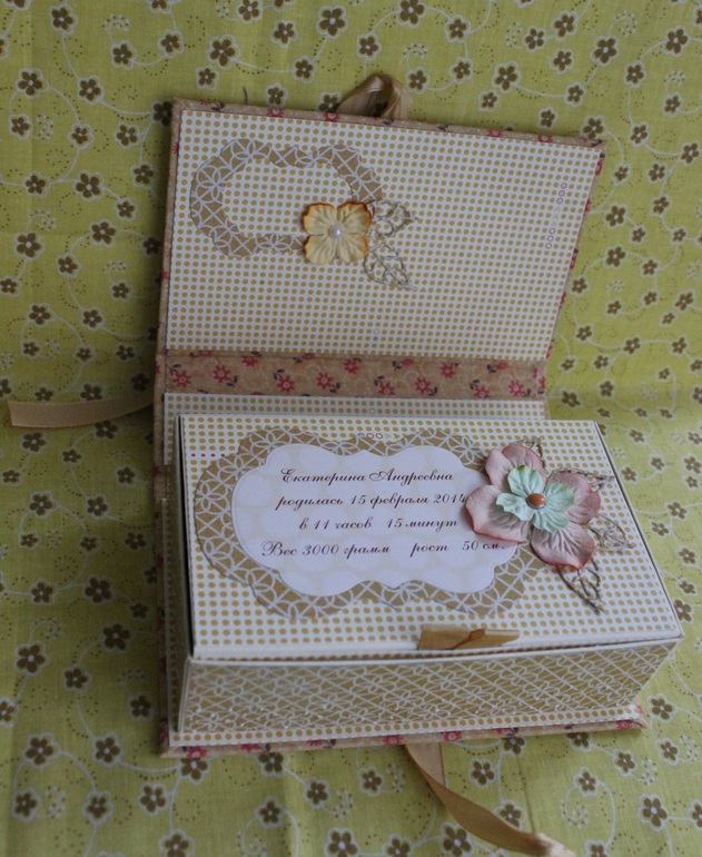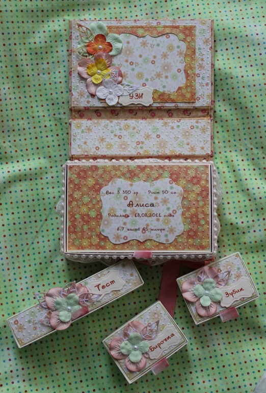 В каждой коробочке по три маленькие коробочки для бирочки, зубика и теста. Так же есть окошко для фото УЗИ. И написаны данные малышек при рождении.