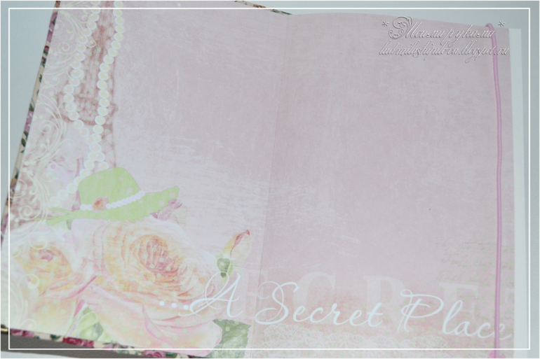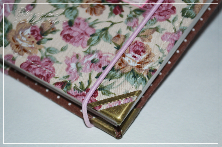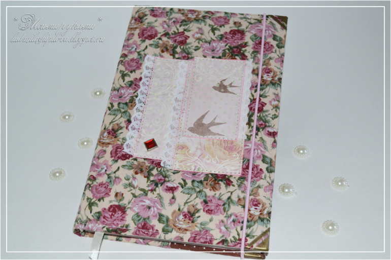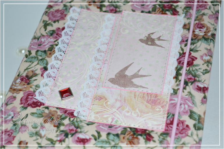 А вот и ежедневник. Формат А5 (~14*20,5 см.), обложка мягкая хлопковая (сочетание 2-х видов), внутри использован готовый блок, форзацы скрап бумага от Fleur Design. Закрывается ежедневник на резинку.