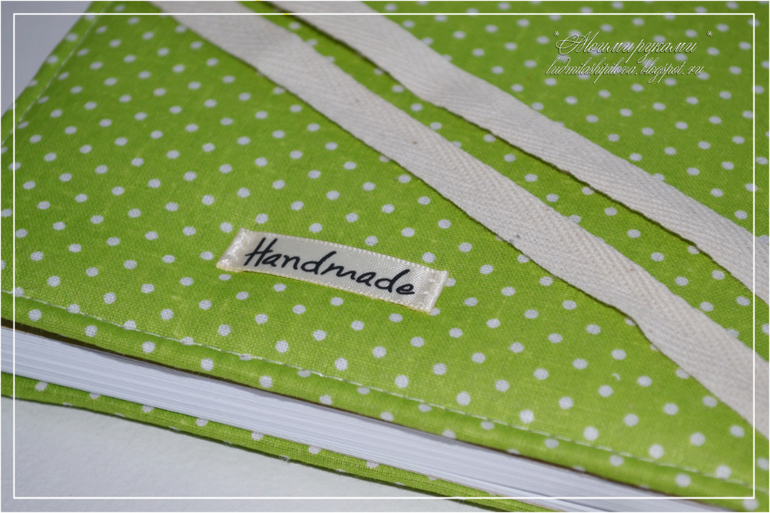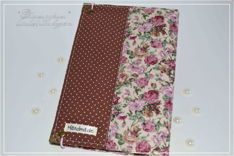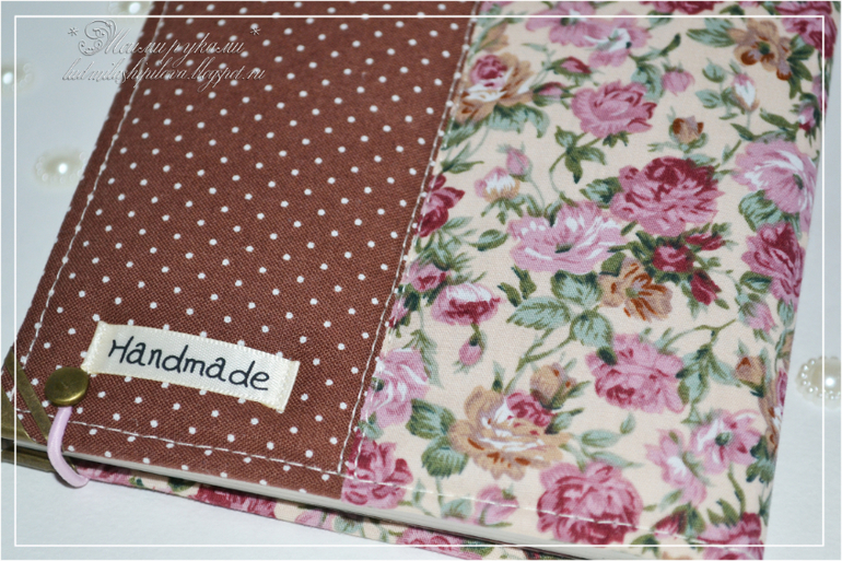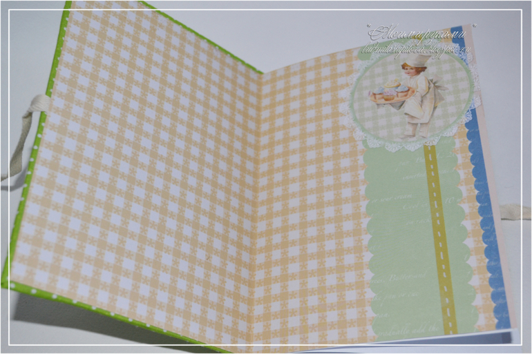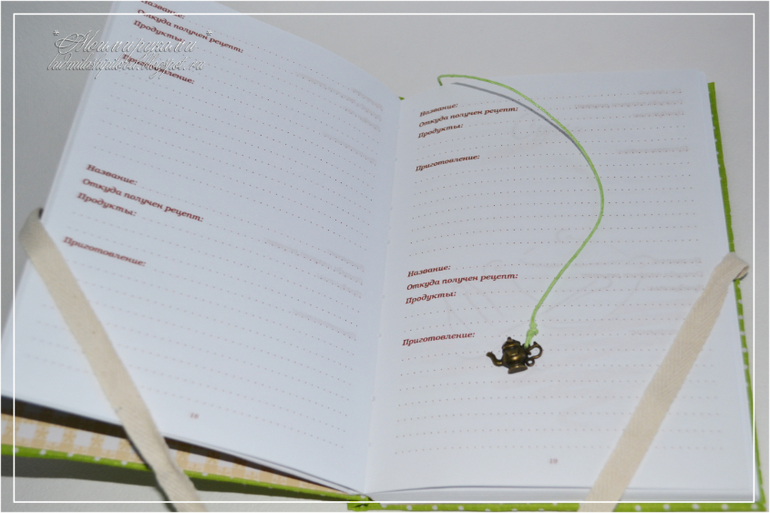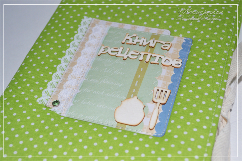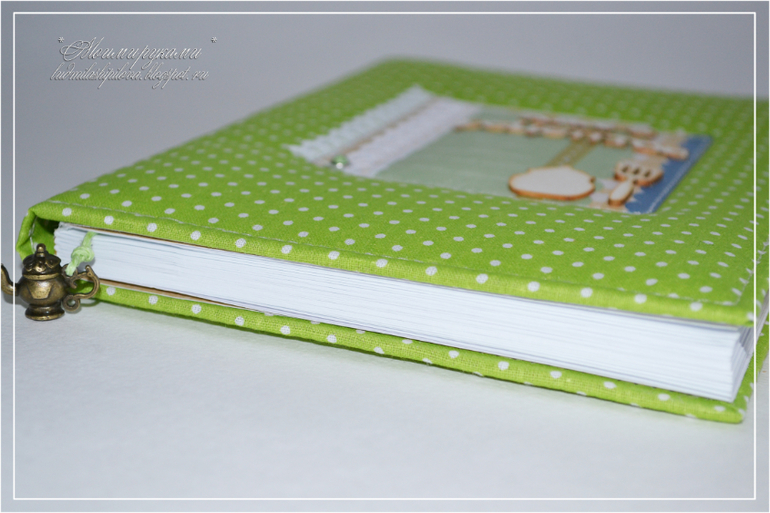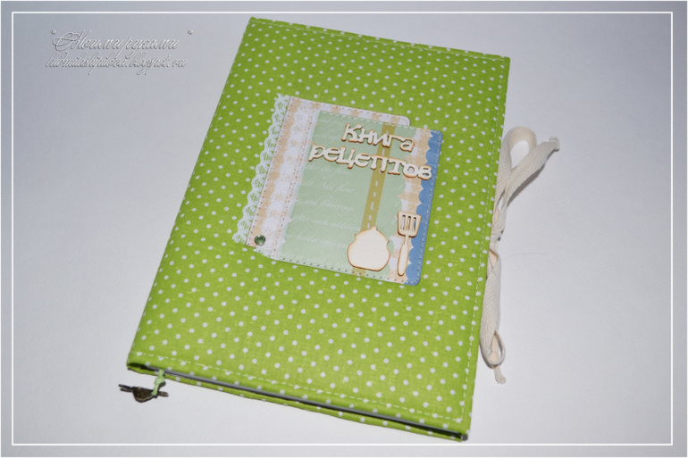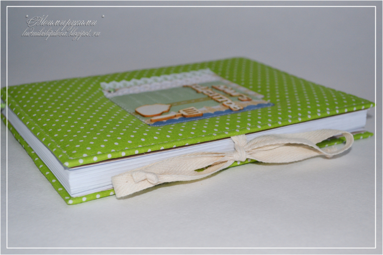 Размер 14,5*20,5 см., в основе плотный картон 1,5 мм., проложена синтепоном, ткань-хлопок 100%. На обложке красуется чипборд, кружевная лента, брадс, закладка - шнурочек с чайничком, форзацы из очень милой скрап бумаги с поваренком, блок использовала готовый.