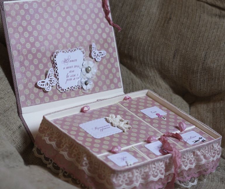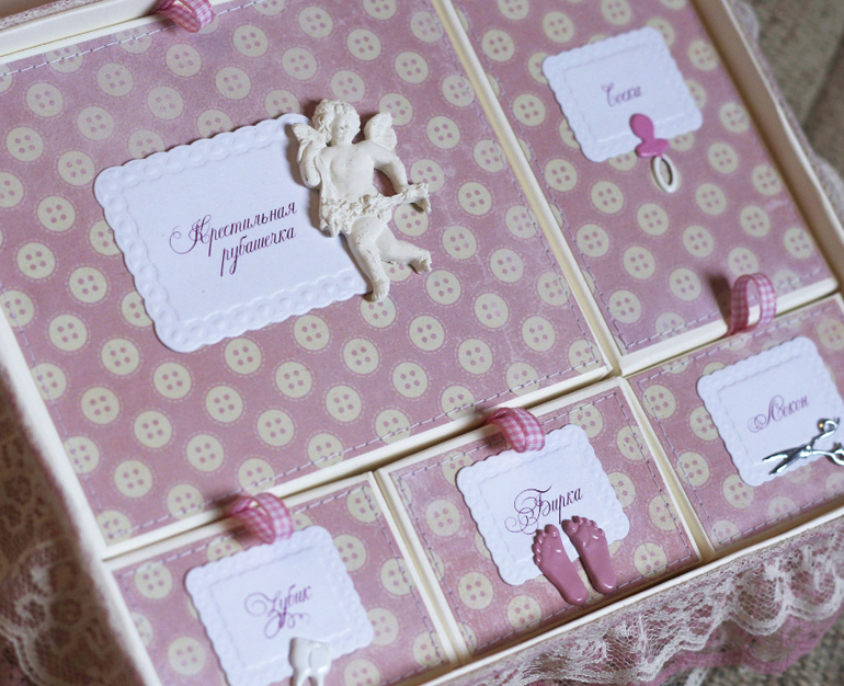 5 ячеек - для крестильного комплекта, соски, бирочки, локона и первого зубика.