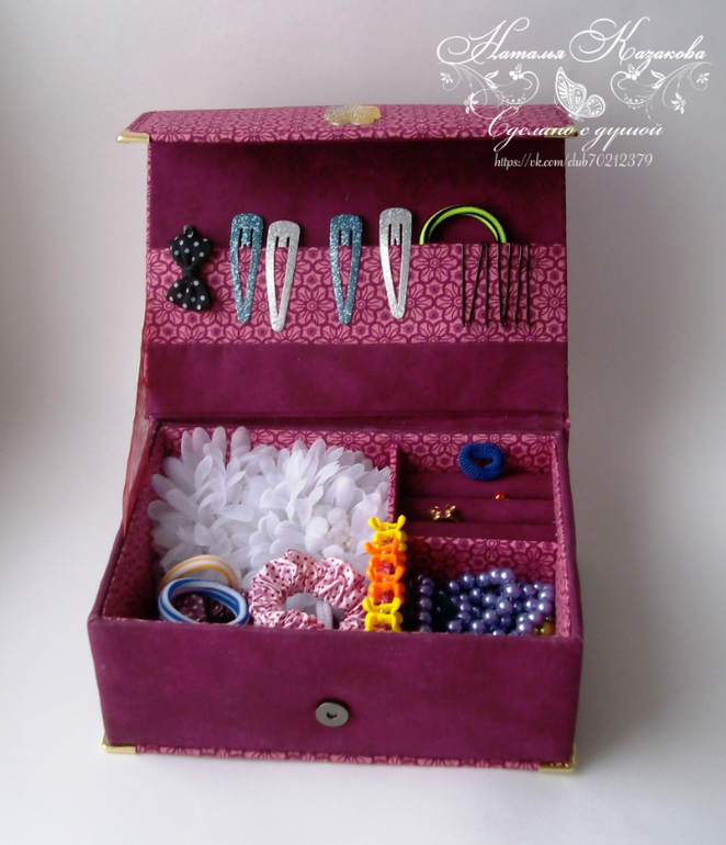 Благодаря МК всем известной мастерицы Вероника решилась сделать первую в своей творческой жизни шкатулочку. Предназначена она для дочкиных заколок. И самый лучший подарок для каждой мамы и мастерицы - это неумолкающе-повторяющий ребенок: "Мама, какая красота! Какая красота, как она мне нравится! Спасибо, мамочка")))))))