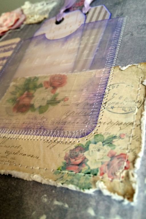 Альбом получился очень нежный, в декоре использовано много цветов, тесьмы, лент, кружева. Обложка выполнена из хлопчатобумажной мягкой ткани, завязывается на ленту. Каждая страница и подложки для фотографии отстрочены на швейной машинке (для меня это был первый опыт работы с машинкой).