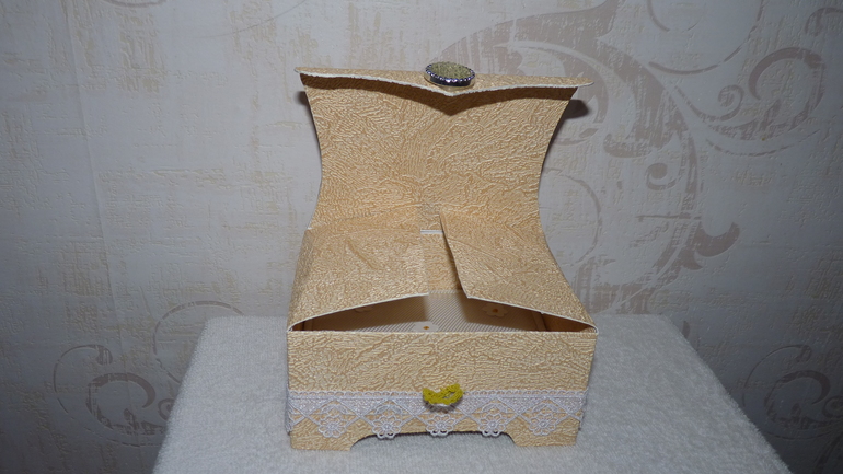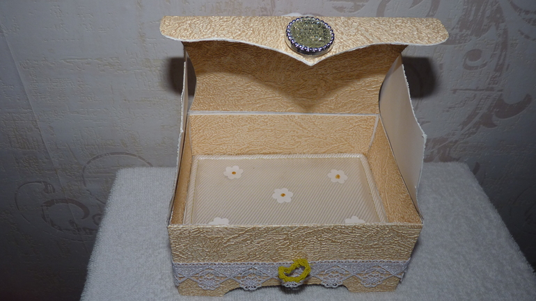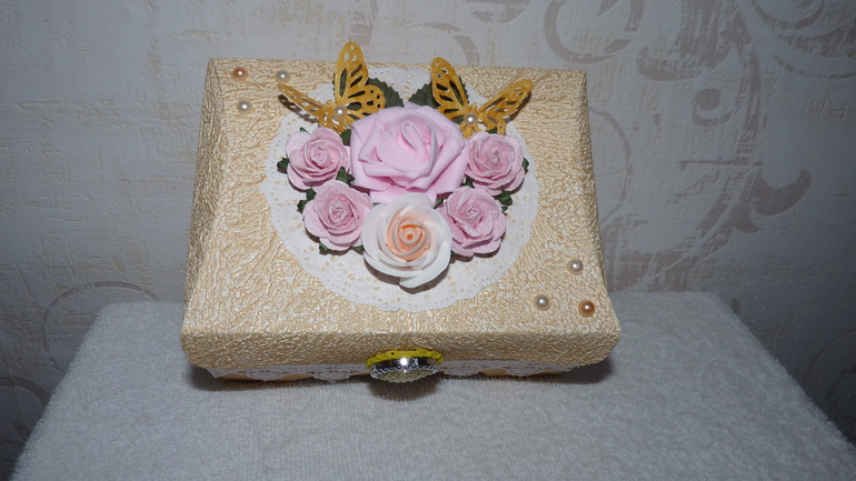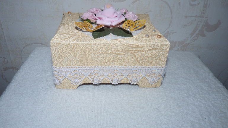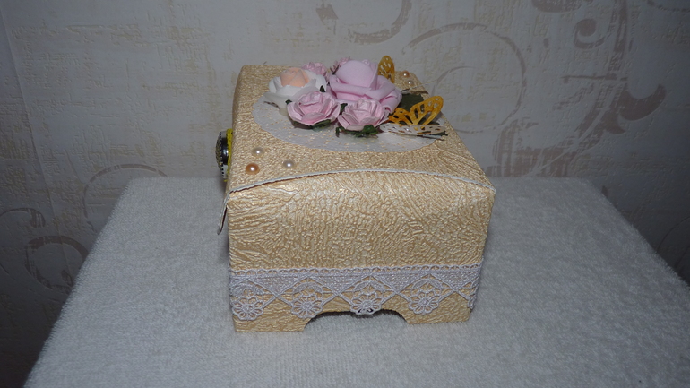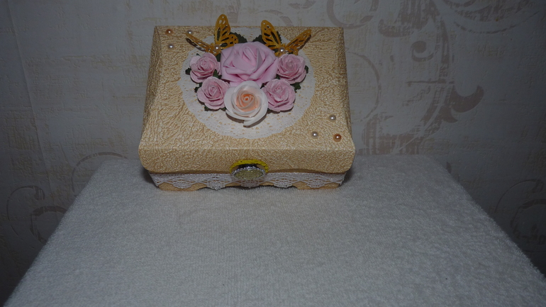Красивая форма шкатулки! Но вот оформление немного изменила бы. Кружевную ленту не стала бы вообще использовать по периметру, бабочки тоже. Цветы посажены как в огороде - на равном расстоянии . Старайся их темнее собирать в композицию. Ты уже не обижайся, что я так прямо - все из лучших побуждений)