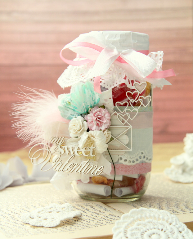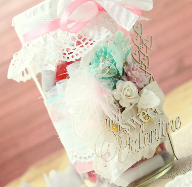 Для украшения баночки я взяла немного цветочков, бумагу Prima, шитье, шебби ленточки и мега красивый чип от Wycinanka.