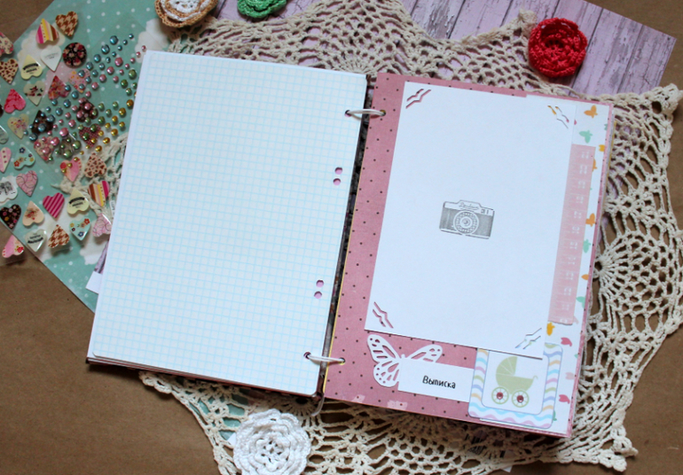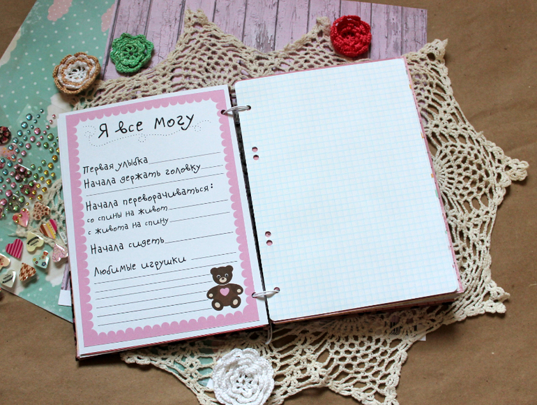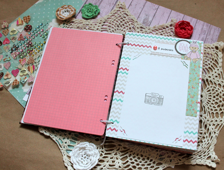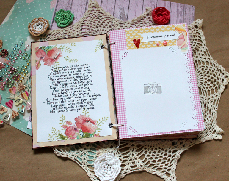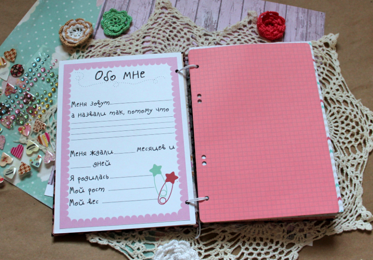 Также вмещает много фото,карточек для записи важной информации о развитие малышки,красивые стихи на обоих форзацах по желанию мамочки.