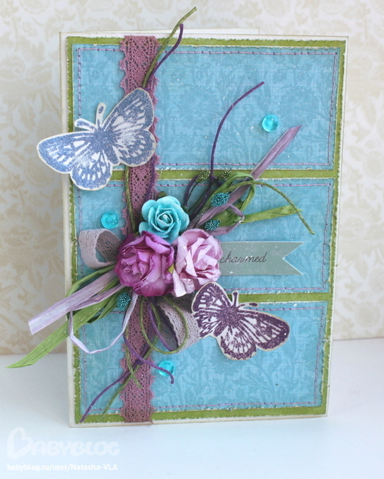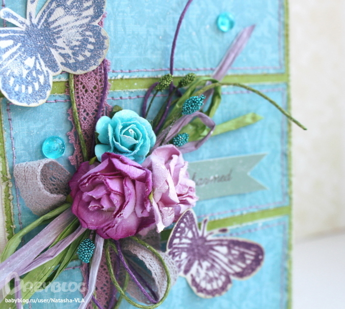 Бумага Webster's Pages , хлопковое кружево двух цветов, вощёные шнуры, акриловые капли, цветочки, бабочки- горячий эмбоссинг, самодельные тычинки из микробисера .