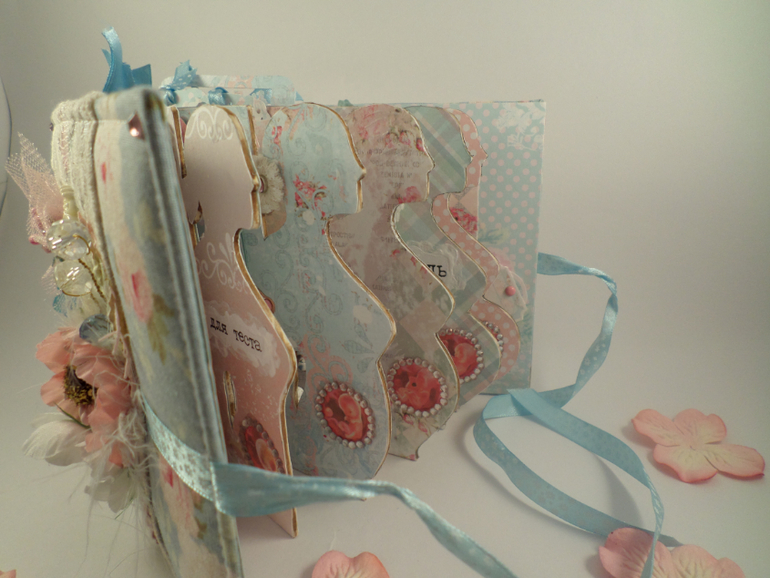 Есть карточки для записей,место для теста и фото с УЗИ. Большое фото родившегося малыша также туда поместиться. Кстати,странички альбома растут вместе с вашим пузиком!