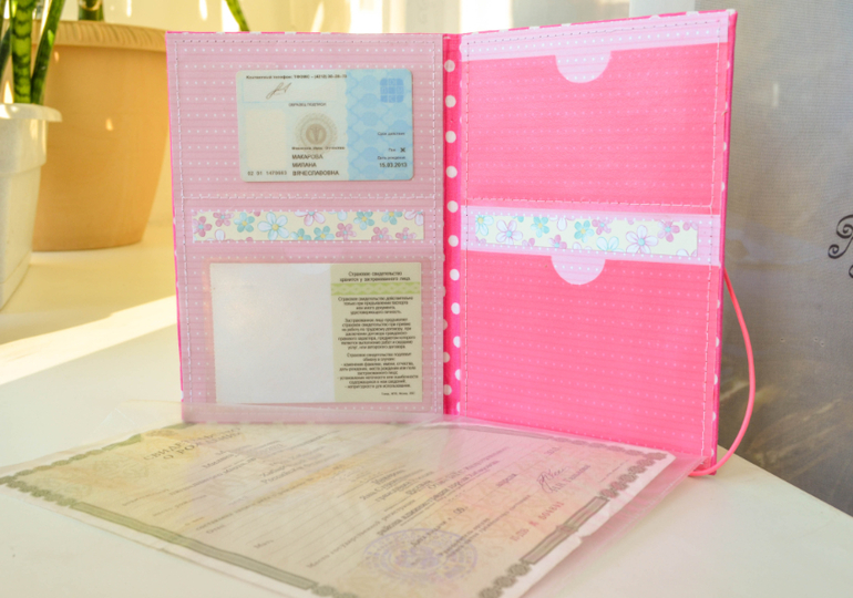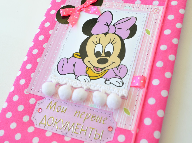 Обложки на паспорт и свидетельстваПокажу вам еще одну папочку с участием Минни, только уже совсем малышки)) Признаюсь, слифтила идею с ушками у кого не знаю))) Формат папки 19*13 см, попросили сделать много горизонтальных кармашков уж зачем не знаю)))