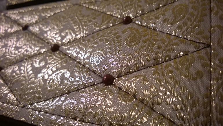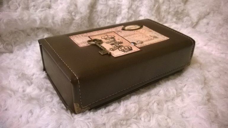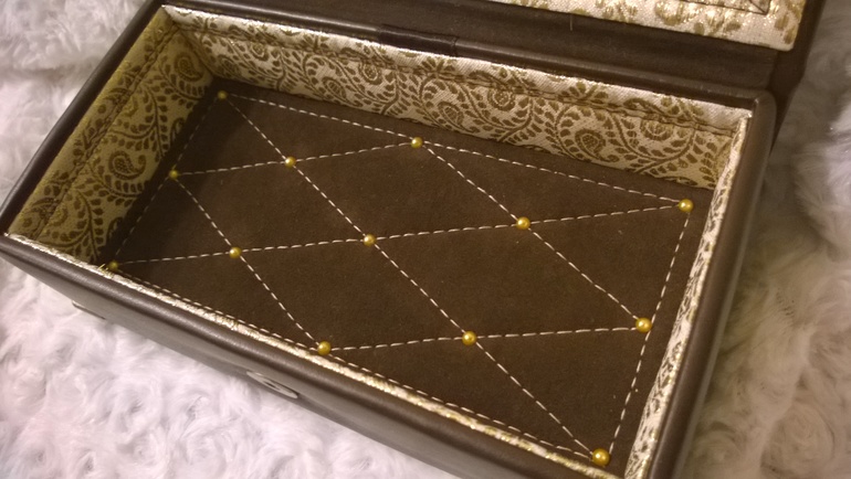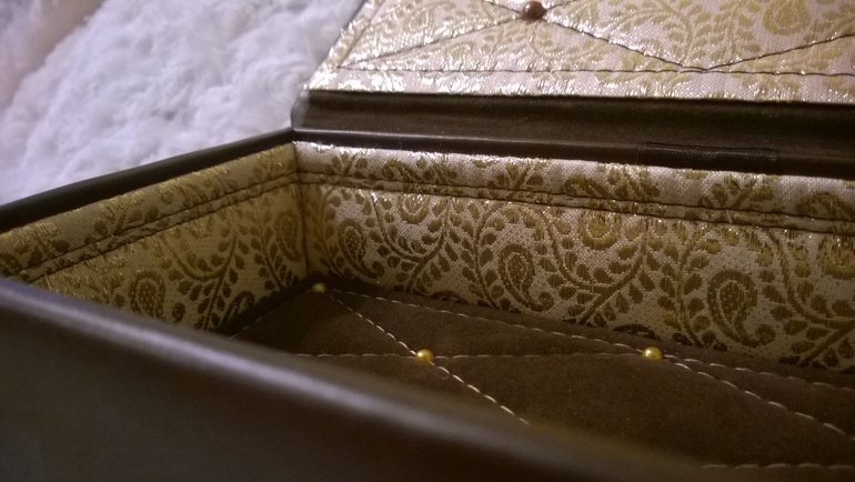 Шоколадный кожзам, внутри как обычно без бумаги: стенки я проложила синтепоном на этот раз, сделала сверху двойную строчку, дно - замш, ромбы, на крышке тоже ромбы. Нравится мне, как они в шкатулках смотрятся.