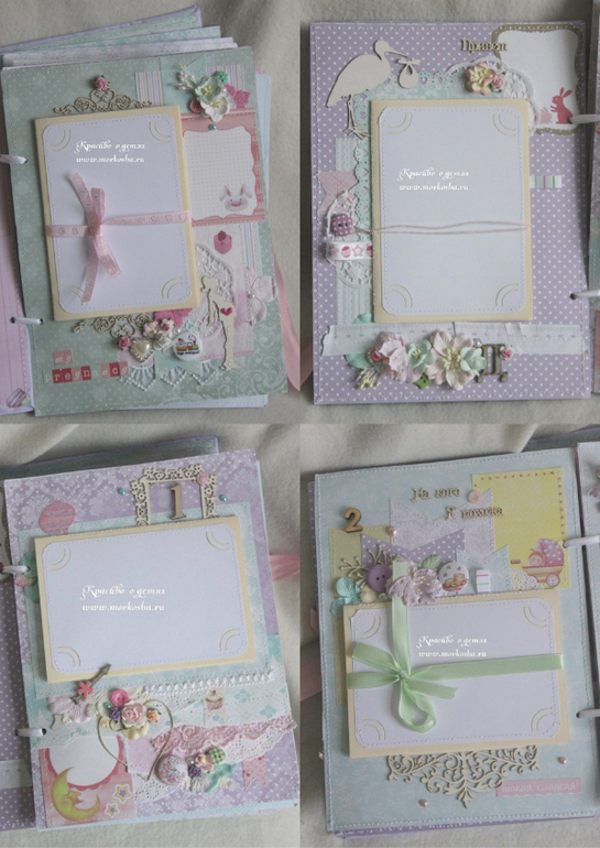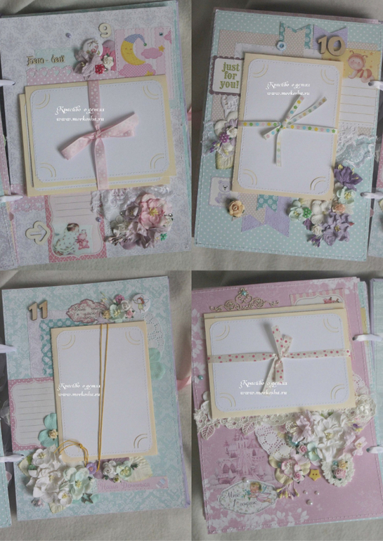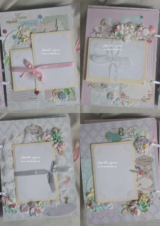 Он состоит из 16 страниц (12 страниц от 0 до 1 года, страница о беременности, страница о выписке, страница о крещении и страница о первом Новом годе малышки) вмещает 120 фотографий 10х15см. На форзацах альбома - 2 прозрачных кармашка для различных табличек-наблюдений (роста-веса-достижений-зубов), узи мамы или доп.фотографий. На каждой странице есть место для записи каких-нибудь мелочей о малышке.