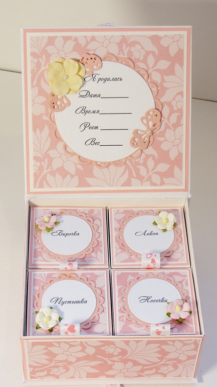 да, много этих коробочек. Но, Свет, ведь просят. Я вообще их не собиралась делать, когда первые сделала — это было так, от скуки, а потом просто попросили. У меня руки, наконец, дошли до альбома для собственных деток, пока с младшей начала. Да, и спасибо за поздравление!)))