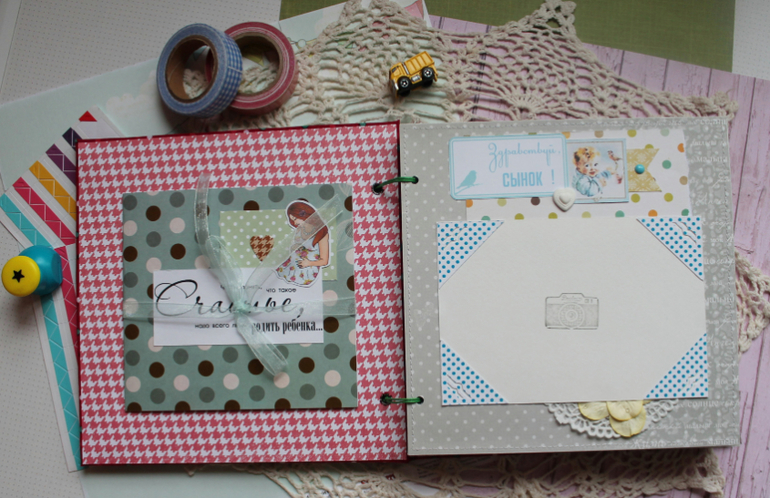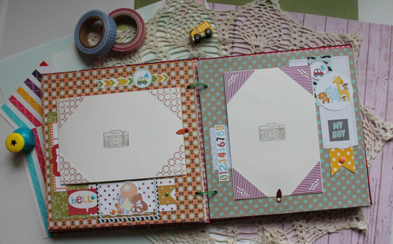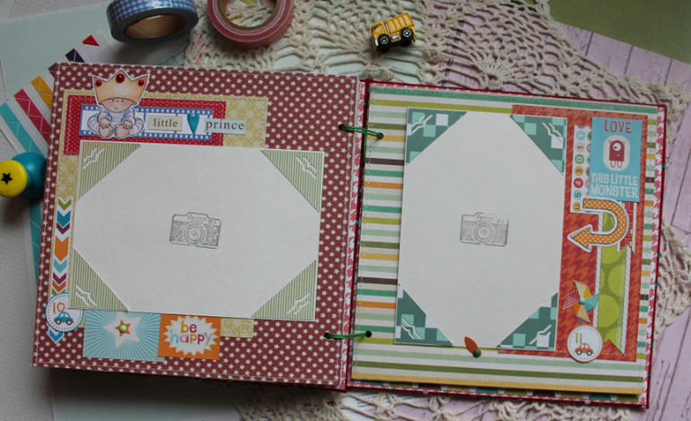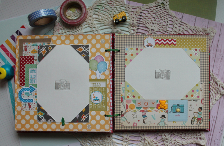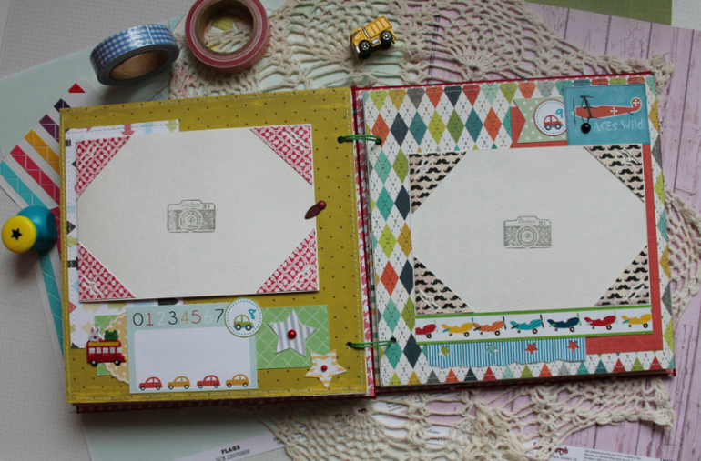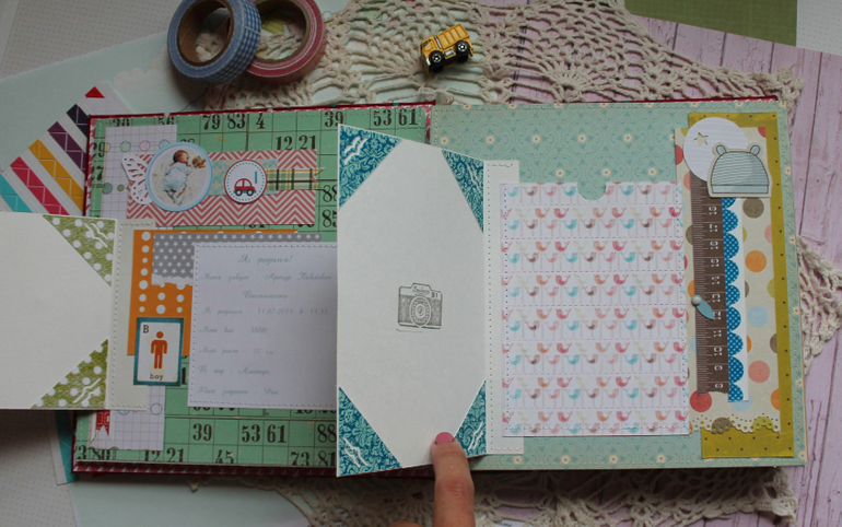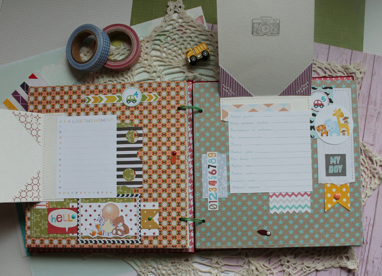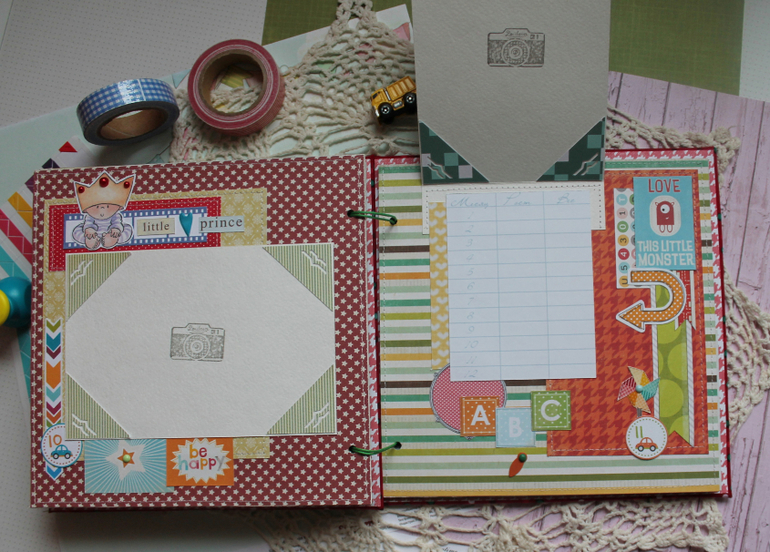 У меня сегодня детский альбом,для мальчика :) С большим удовольствием его делала и даже закончила раньше предполагаемых сроков-вот что значит нашло вдохновение!:)) Альбомчик первого года жизни ,формат 20*20 см,7 листов /14 страничек-по одной на каждый месяц + выписка+ крестины по желанию мамочки.Есть место для записей графика роста /веса, достижения, карманчик в который можно спрятать отпечатки любимых маленьких ручек/ножек:) Рассчитан на 27 фото 10*15, на заднем форзаце сделала дополнительный карманчик для фото или еще какой- нибудь полезной и памятной вещи малыша.На первом форзаце есть книжечка для двух дисков УЗИ. Вообщем получился такой яркий и интересный пухлячок!:)