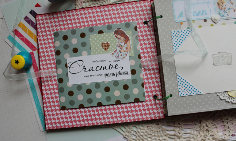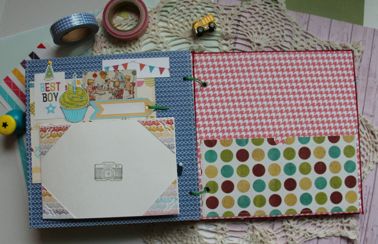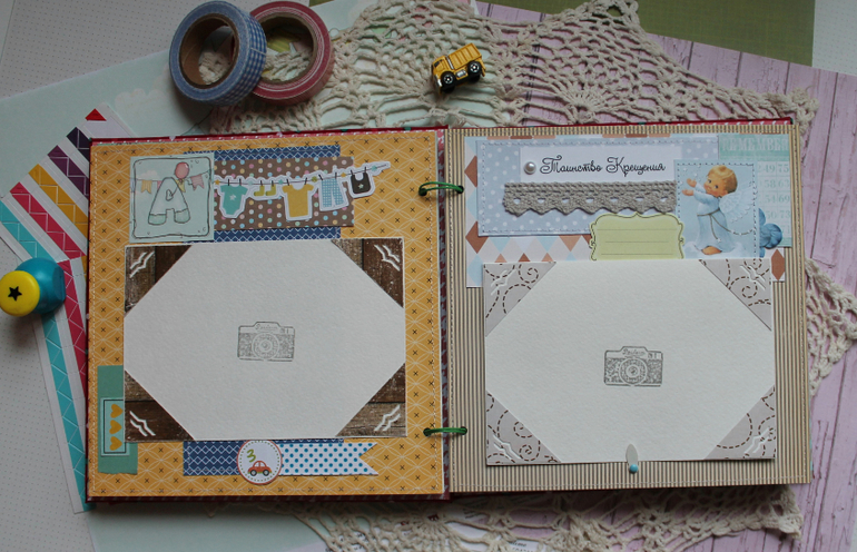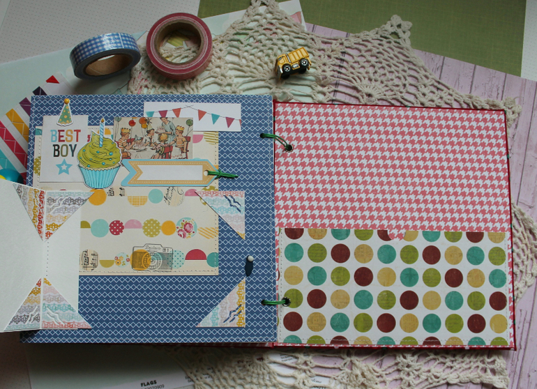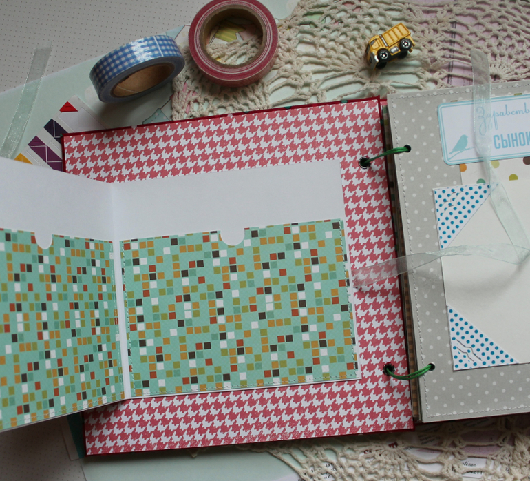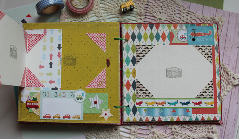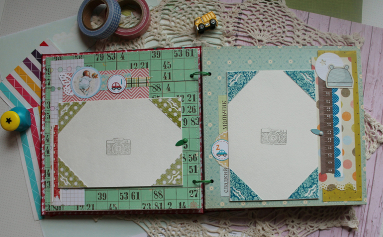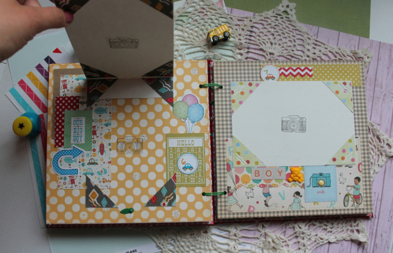 У меня сегодня детский альбом,для мальчика :) С большим удовольствием его делала и даже закончила раньше предполагаемых сроков-вот что значит нашло вдохновение!:)) Альбомчик первого года жизни ,формат 20*20 см,7 листов /14 страничек-по одной на каждый месяц + выписка+ крестины по желанию мамочки.Есть место для записей графика роста /веса, достижения, карманчик в который можно спрятать отпечатки любимых маленьких ручек/ножек:) Рассчитан на 27 фото 10*15, на заднем форзаце сделала дополнительный карманчик для фото или еще какой- нибудь полезной и памятной вещи малыша.На первом форзаце есть книжечка для двух дисков УЗИ. Вообщем получился такой яркий и интересный пухлячок!:)
