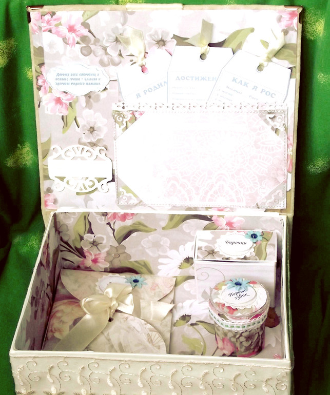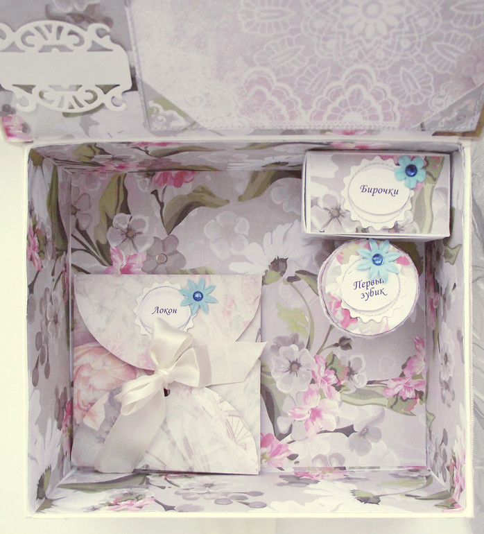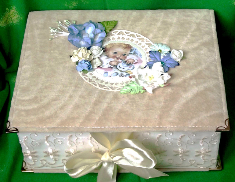 Коробки, шкатулки, комодыПродолжаю тренироваться. Теперь шкатулка для нашей крестной, у нее сынок. Не хотелось мне внутри занимать место большими коробками, решила сделать коробочку только под бирку, под зубик ограничилась круглой (т.к. не понимаю зачем под маленький зубик делать огромную коробку и занимать место), а под локон сделала конвертик, вот и получилось побольше места под памятные вещи (которые мама сама захочет положить).Размер 20*25