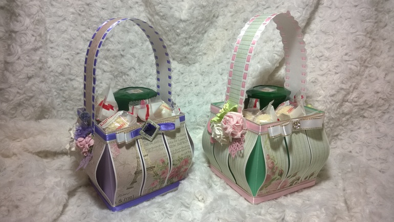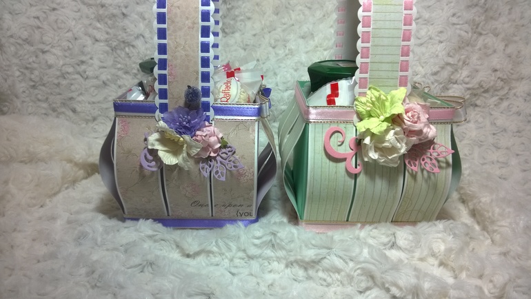 На 1 такую корзинку ушло: фотокартон 300 г размером 30 на 30 см, 1 лист бумаги для черчения, 1 лист скрапбумаги 30 на30+небольшой кусочек и украшалки.