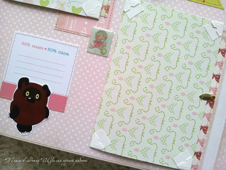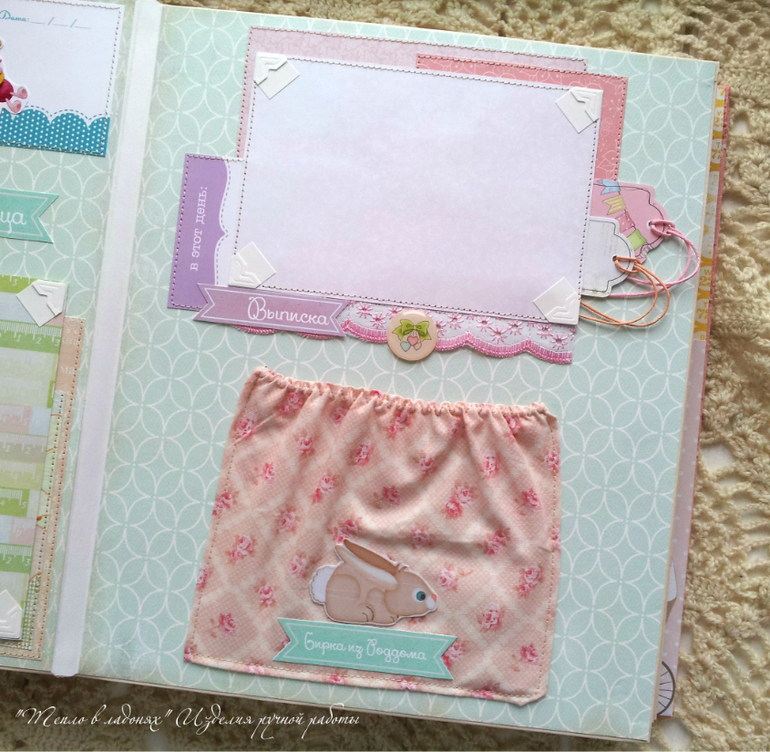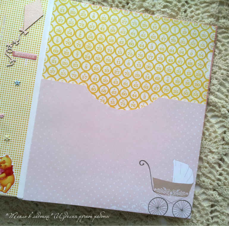 Есть места для важных записей о малышке: метрика, умелки, достижения, зубки, отпечаток ручки и ножки, так же есть кармашки для снимка узи, теста, и бирочки из роддома.