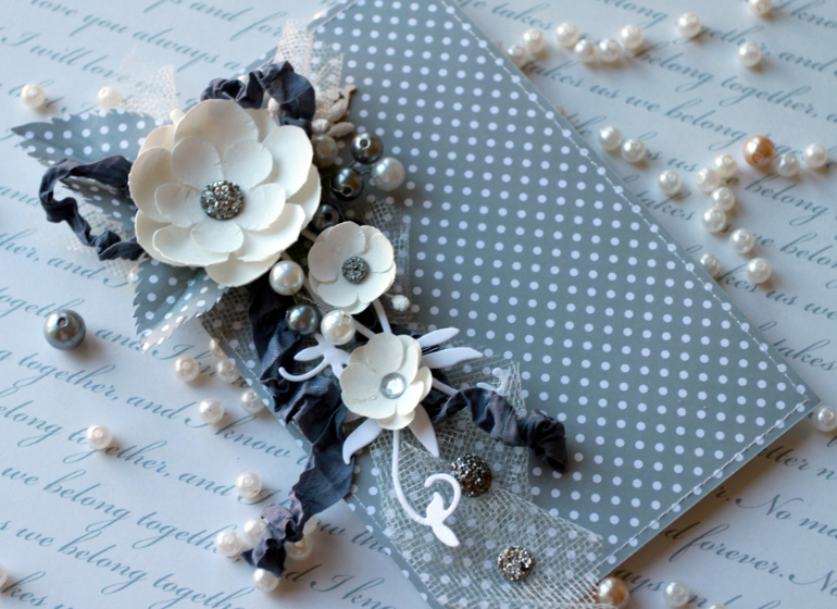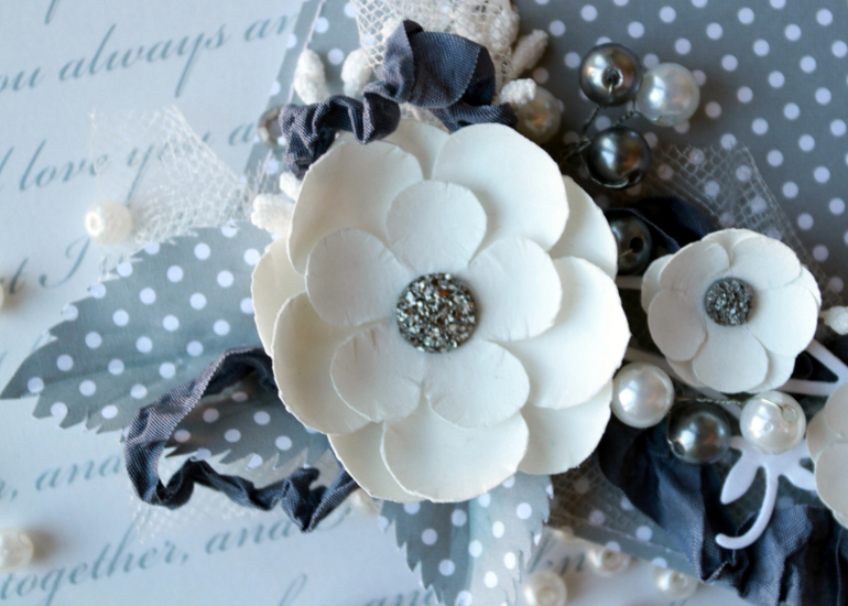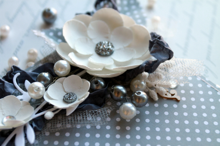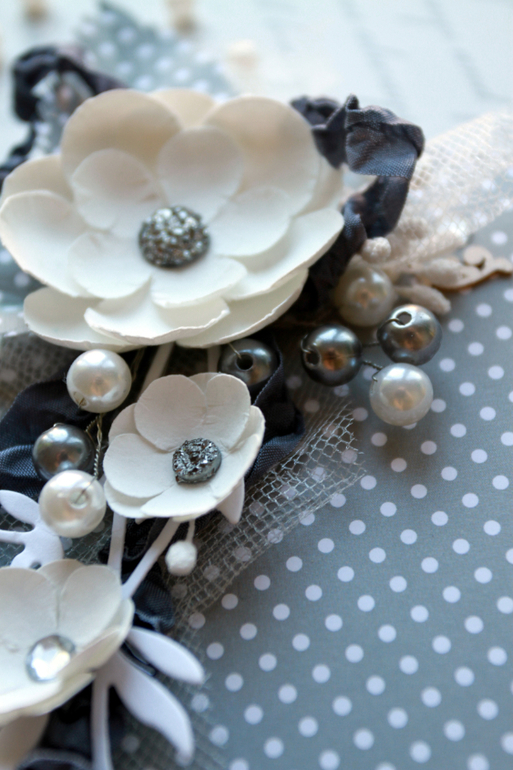 Цветочки я сделала из молочного кардстока, серединка - декоративные страза от Prima
