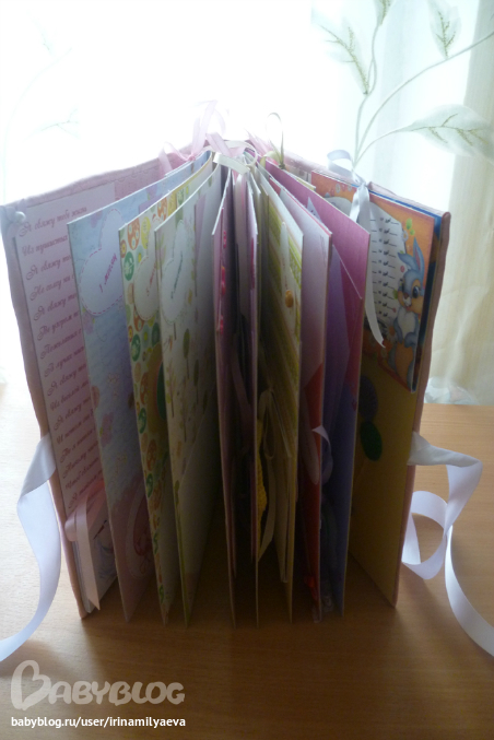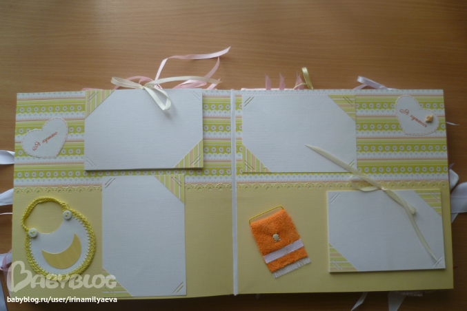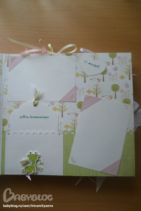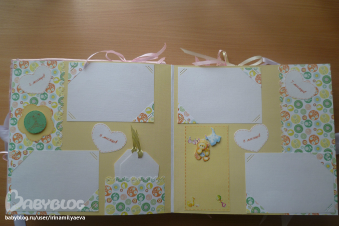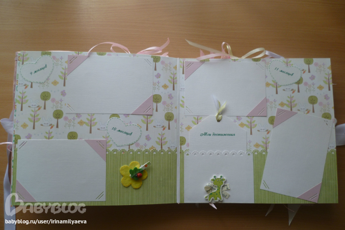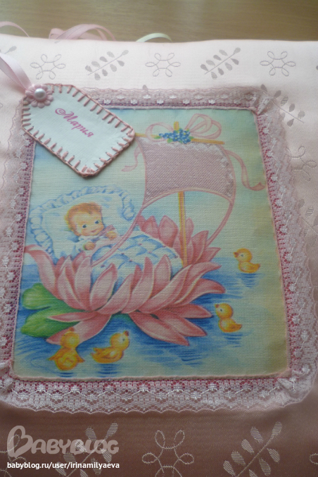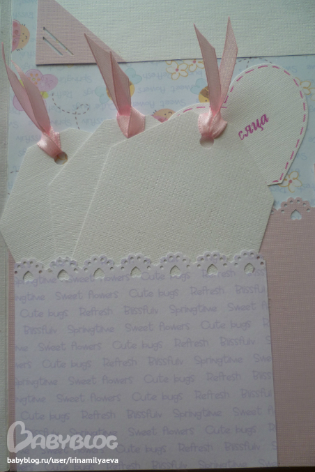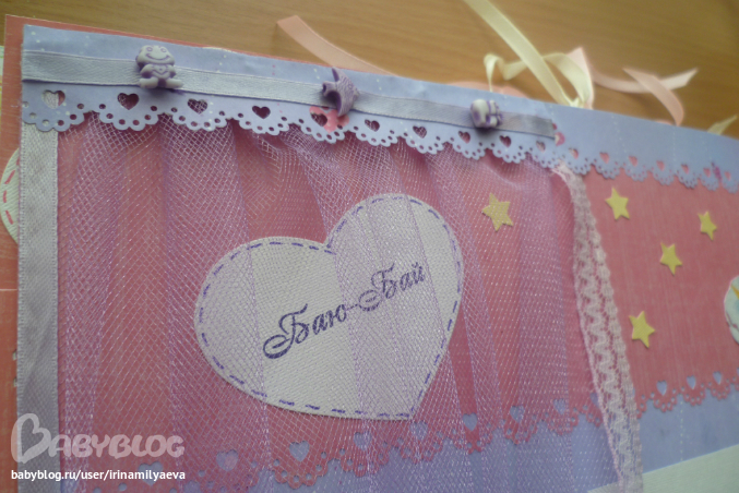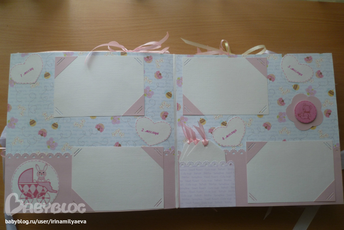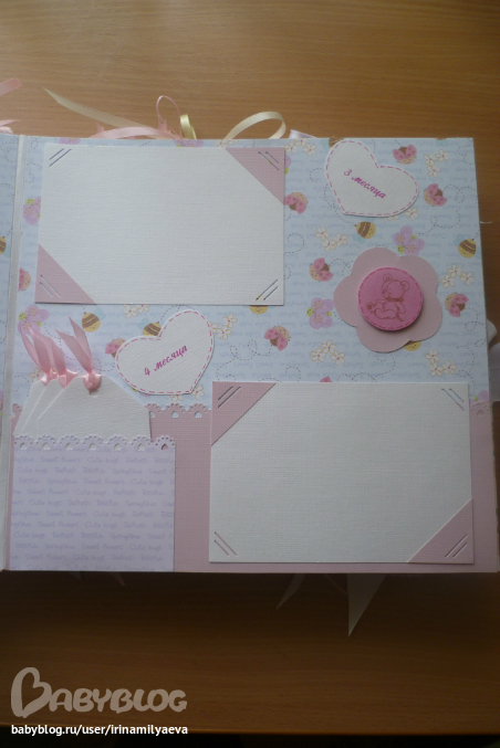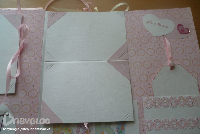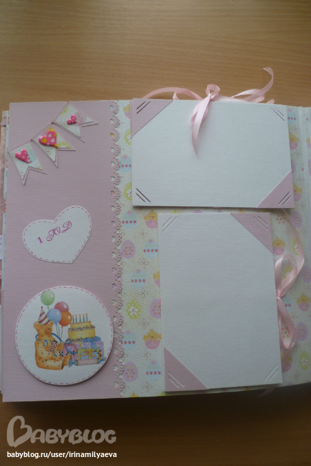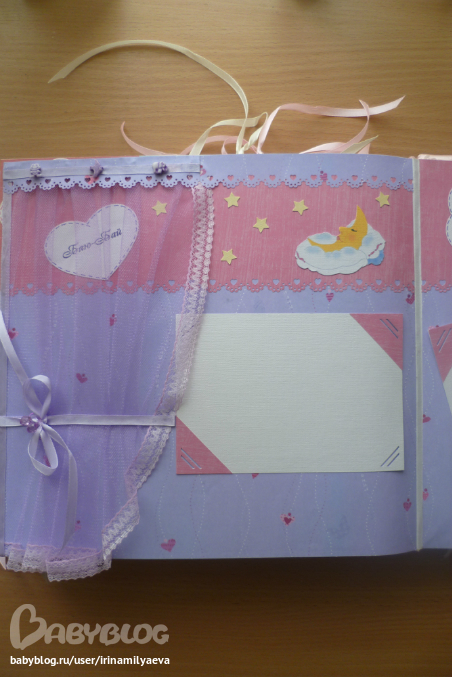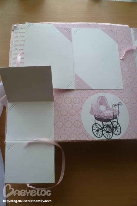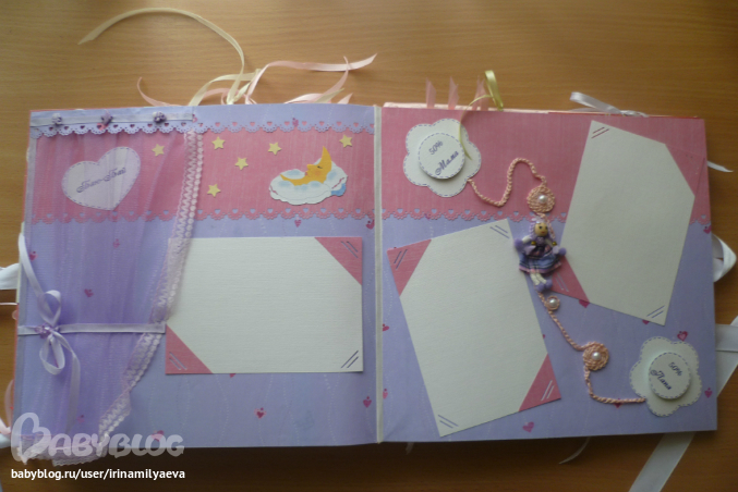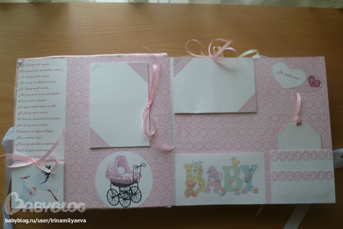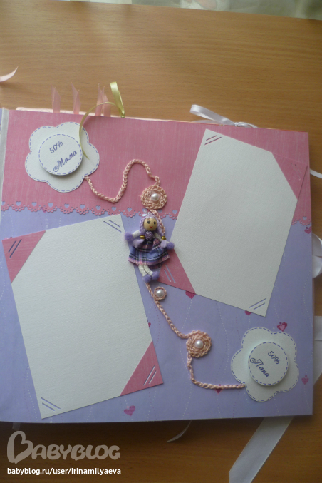 Альбомы ДетскиеВсем привет!!! Сотворился у меня альбом для девочки, на заказ. Долго делала, почти месяц. Альбом: 30*30 в мягкой атласной обложке на синтепоне. Переплет Виноградовой, 8 листов, 9 разворотов. Вмещает 53 фото 10*15. Есть место для снимков УЗИ, кармашки для бирочек из роддома; зубки, рост, вес и конверт для двух дисков. Приятного всем просмотра!!!