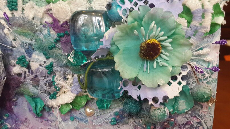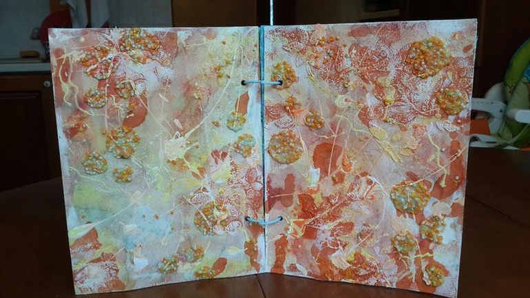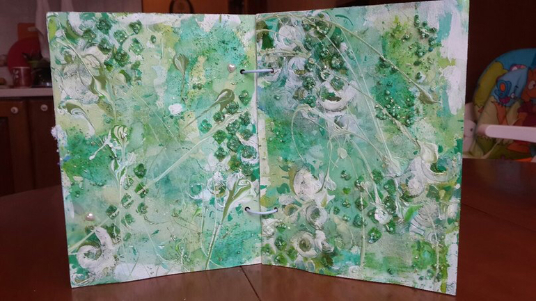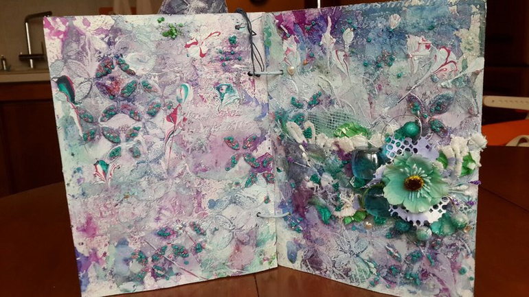 И снова привет! Удалось мне тут побывать на МК киевской мастерицы Татьяны Комаровой, вот на нем я и познакомилась с техникой Микс Медиа. В итоге получился пестрый альбомчик на 4 разворота