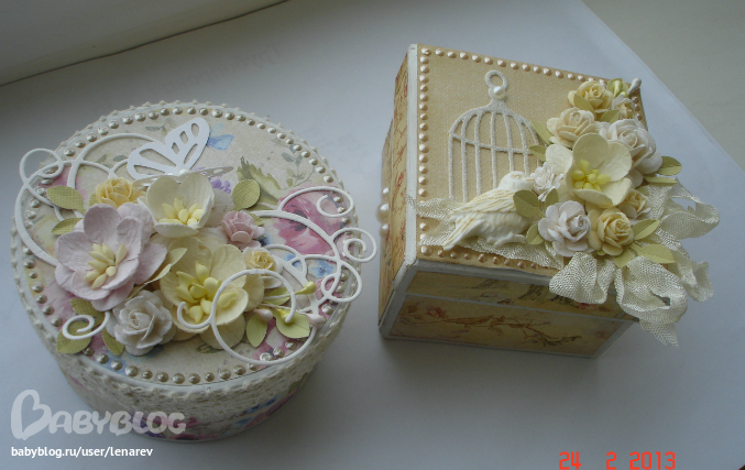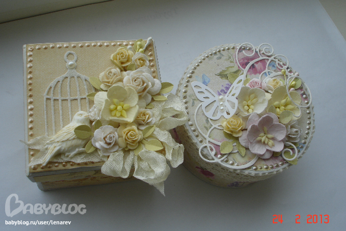 Коробки, шкатулки, комодыИспользовала готовые картонные заготовки, красила белым акрилом и оклеивала бумагой, спасибо за вырубку @aaalll , за птичку @eva_lv