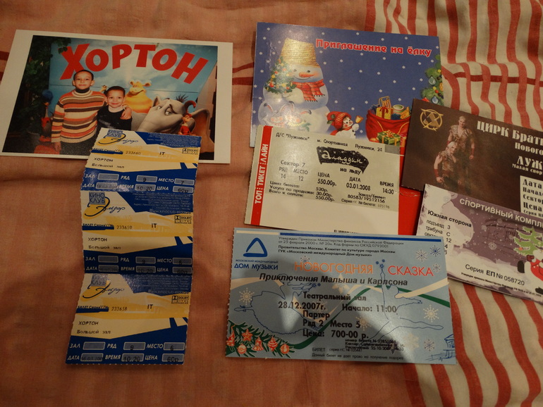 Билеты из кино, ёлок, театров с 2002 года нужно разместить по годам (всё разложу сама) + к чему есть фото, лучше нестандартного размера, т.е. меньше чем 9Х13., запишу на диск и надо будет распечатать. Программки в конец блокнота положить в кармашек. В основном ДЕТСКИЕ!