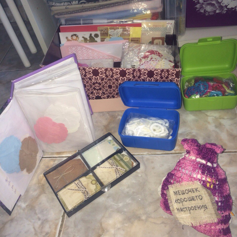 В коробке розово-коричневой бумажные украшательства, в основном вырубка (у меня есть БШ, но ножей мало, поэтому пользуюсь услугами девочек, которые продают/обменивают вырубку), чуток ходовых наклеек, топсы.