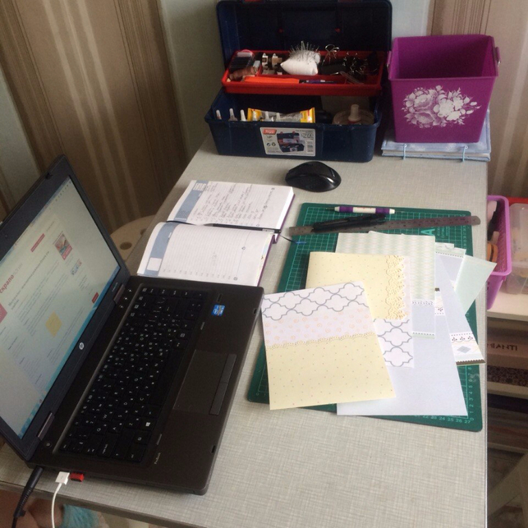 Внешняя сторона окна: тут как видно коврик для резки, рядом бумага 30*30, в самодельных коробочках: справа - незаконченные/в процессе работы странички готовязегося альбома, далее бумага 20*20 и нарезанные основы страниц под альбомы 20*20 и слева нарезанные подложки под фото. Люблю когда уже готовые есть заготовки страниц и подложек - очень удобно и быстро!