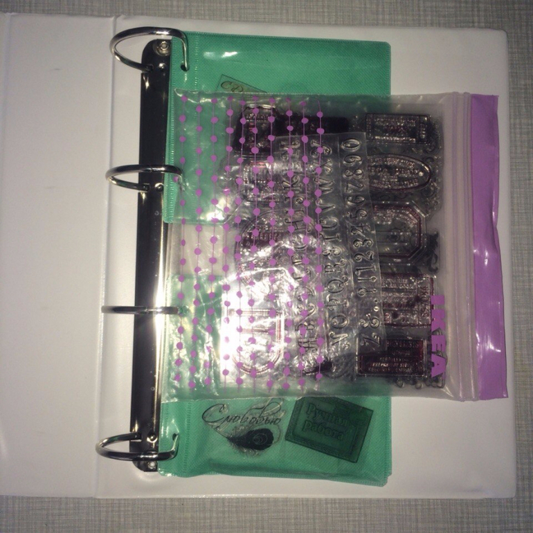 мелкие штампы уложила в найденные мягкие пакетики для дисков, крупные фоновые на заводской пластиковой подложке - в пакете с зиповым замком
