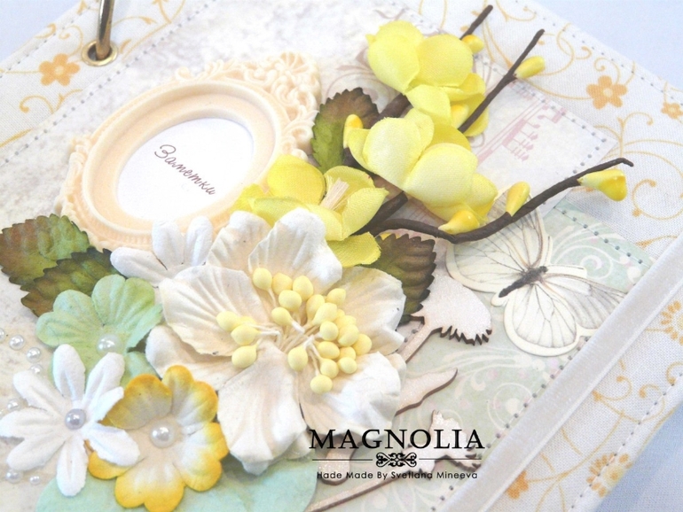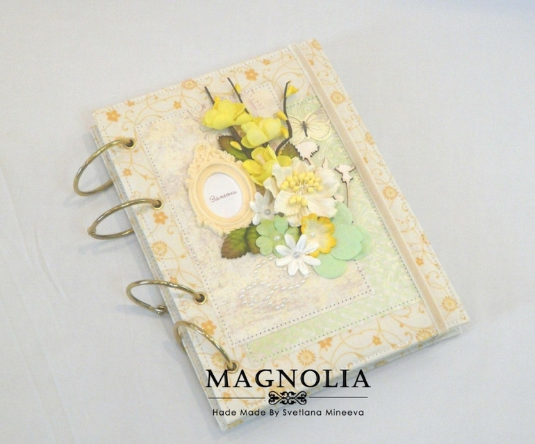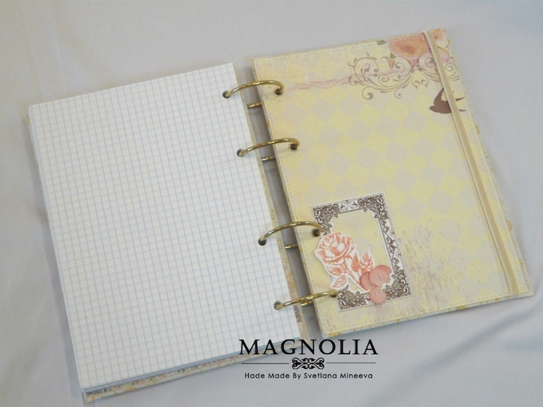 Всем привет! Я сегодня с весенним блокнотиком. Формат А5, внутри два стандартных блока в клетку по 80 листов (суммарно 160 листов). Блокнотик на кольцах. Внутри есть кармашек для записочек