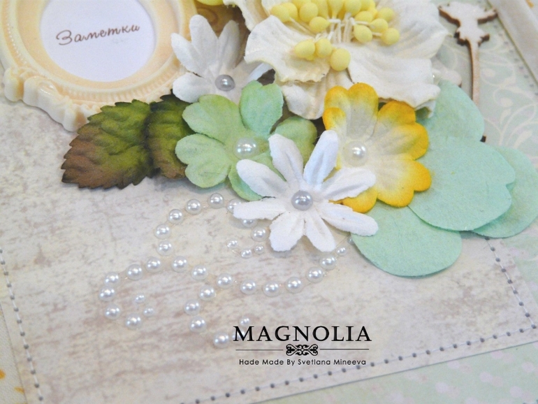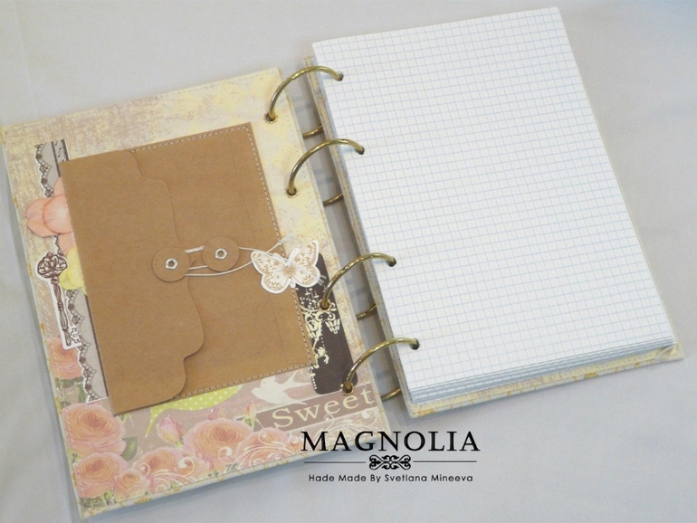 БлокнотыВсем привет! Я сегодня с весенним блокнотиком. Формат А5, внутри два стандартных блока в клетку по 80 листов (суммарно 160 листов). Блокнотик на кольцах. Внутри есть кармашек для записочек
